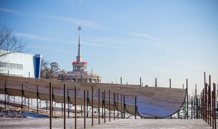 Масштабность сооружения можно оценить уже сейчас, когда рабочие собрали каркас горок и кладут поверх металла деревянный настил.