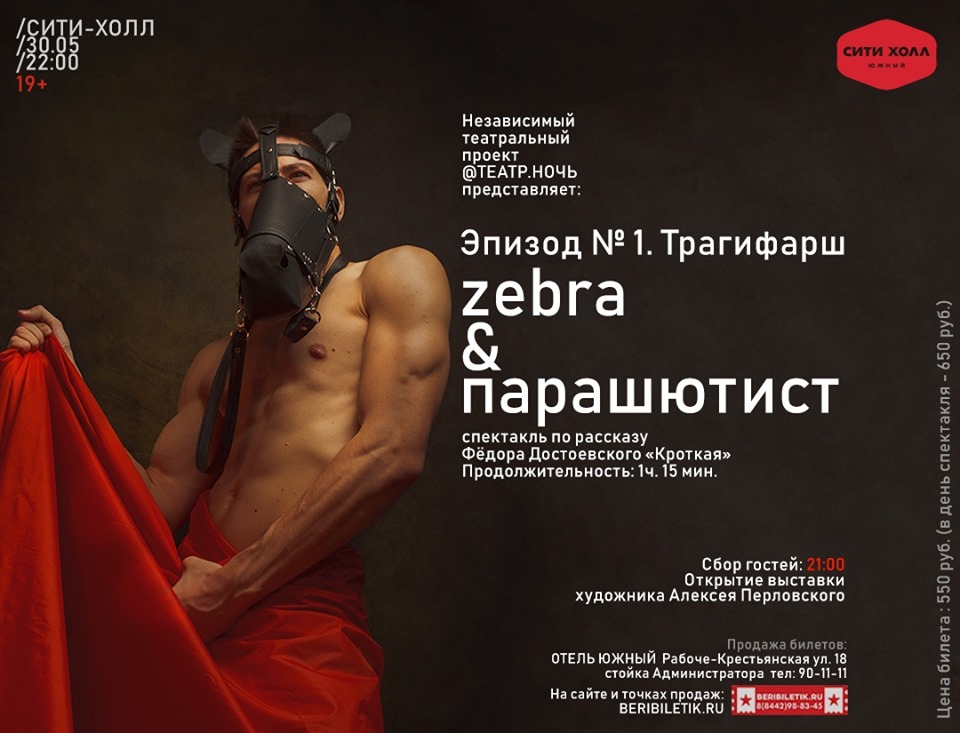 Первый эпизод проекта откроет «трагифарш» «ZEBRA и парашютист» по фантастическому рассказу Федора Михайловича Достоевского «Кроткая». Для тех, кто не помнит (Volganet память освежил): рассказ великого мастера – это, по сути, монолог 41-летнего держателя кассы над телом его 16-летней жены, выбросившейся из окна.