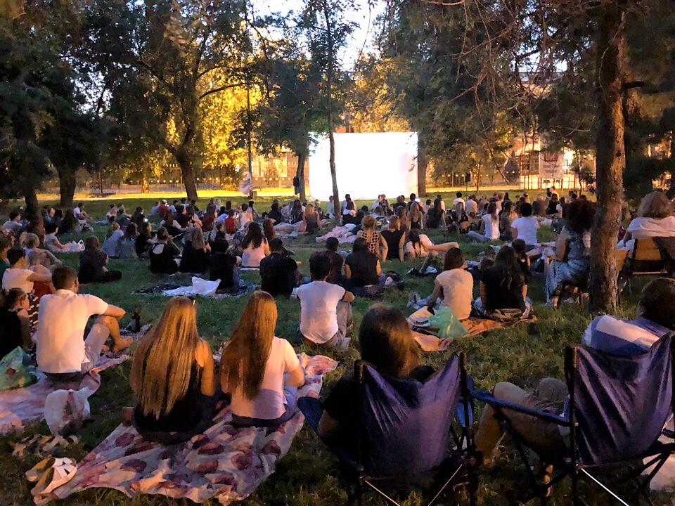 «Кино на траве» в Комсомольском саду каждый четверг собирает всё больше горожан – места на лужайке нужно занимать заранее. Фото: Максим Хмызов-Ченцов