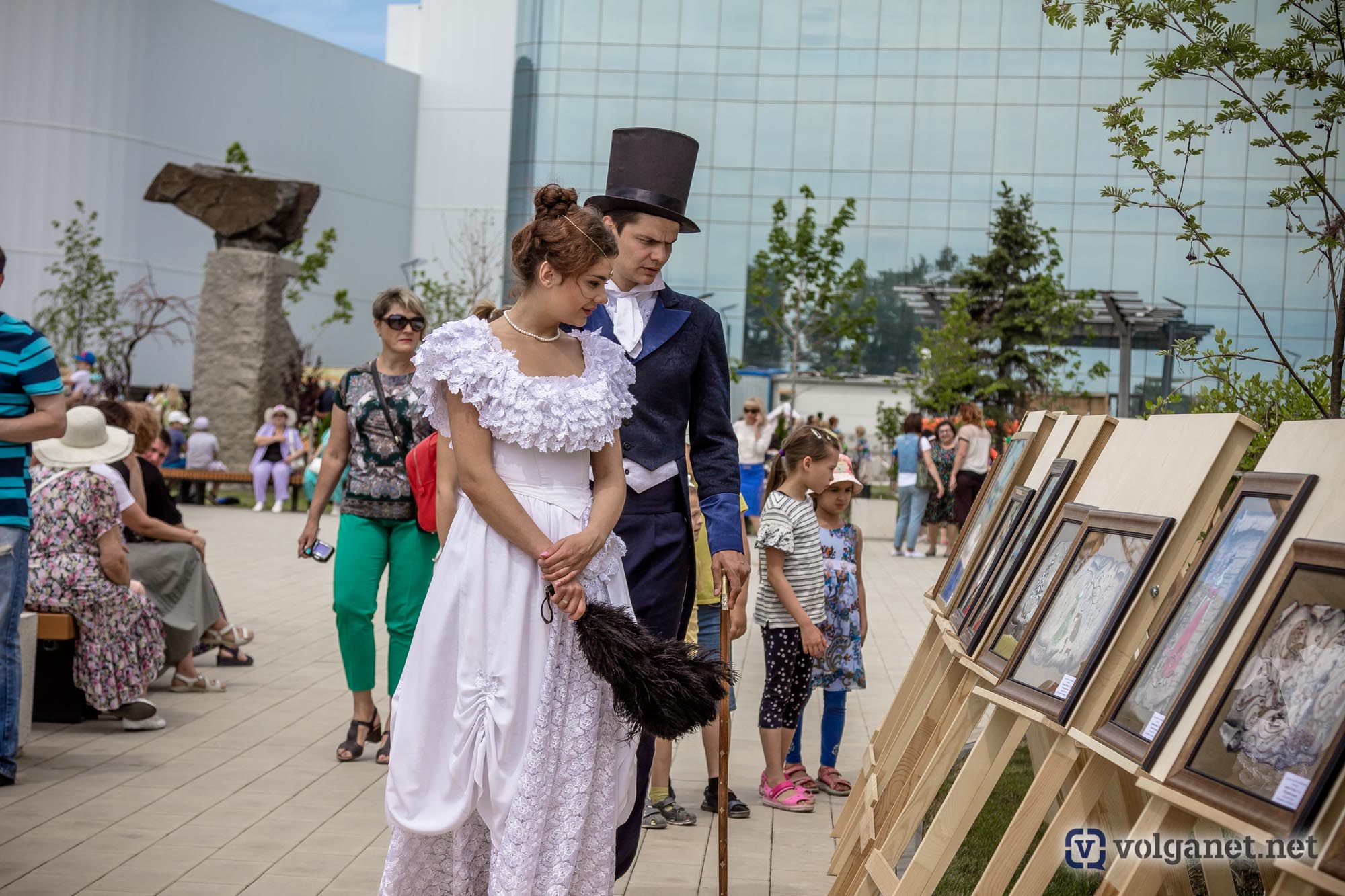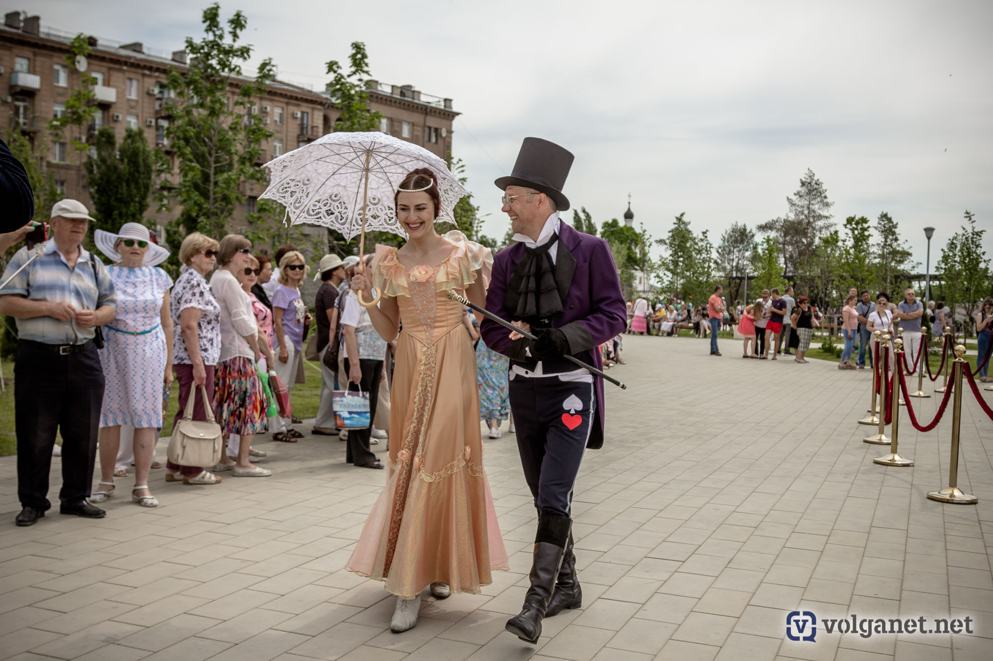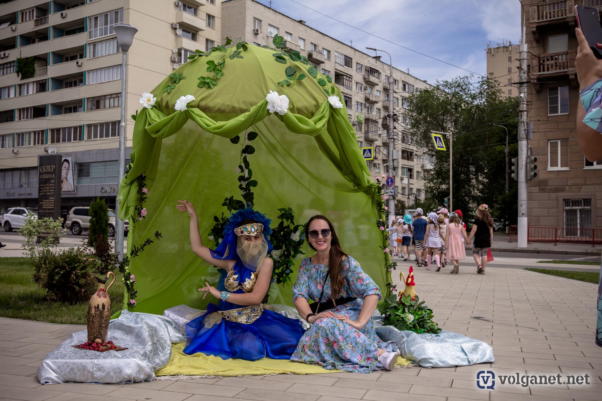 Вдоль аллей расположились несколько фотозон, где желающие фотографировались либо вместе с героями пушкинских сказок, либо вместо них, но – в соответствующей атмосфере. По аллеям чинно расхаживали дамы с кавалерами – актёры Волгоградского музыкального и Волгоградского молодёжного театров – в костюмах эпохи великого поэта.