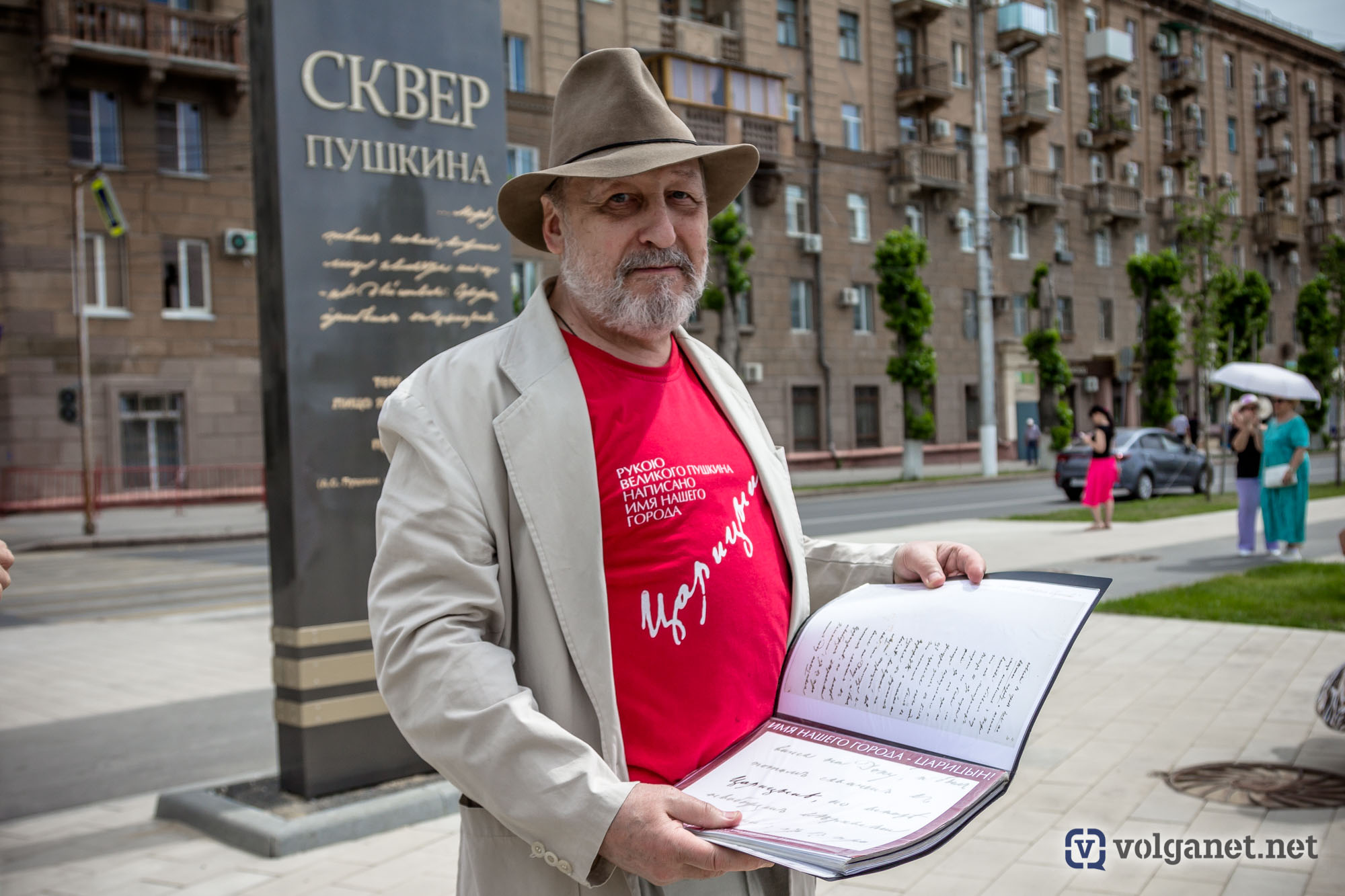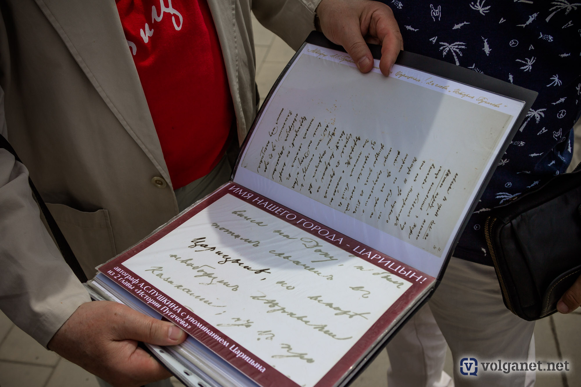 – Ещё в 2014 году я обратился в Санкт-Петербургский музей рукописей Пушкина с просьбой отыскать в рукописях поэта упоминание о нашем городе, – рассказал Владислав Коваль. – И название «Царицын» нашлось во второй главе «Истории Пугачёва». Мне прислали цветные копии рукописи, я даже заказал футболки с этой надписью. В итоге теперь она украшает стелу у входа в сквер.