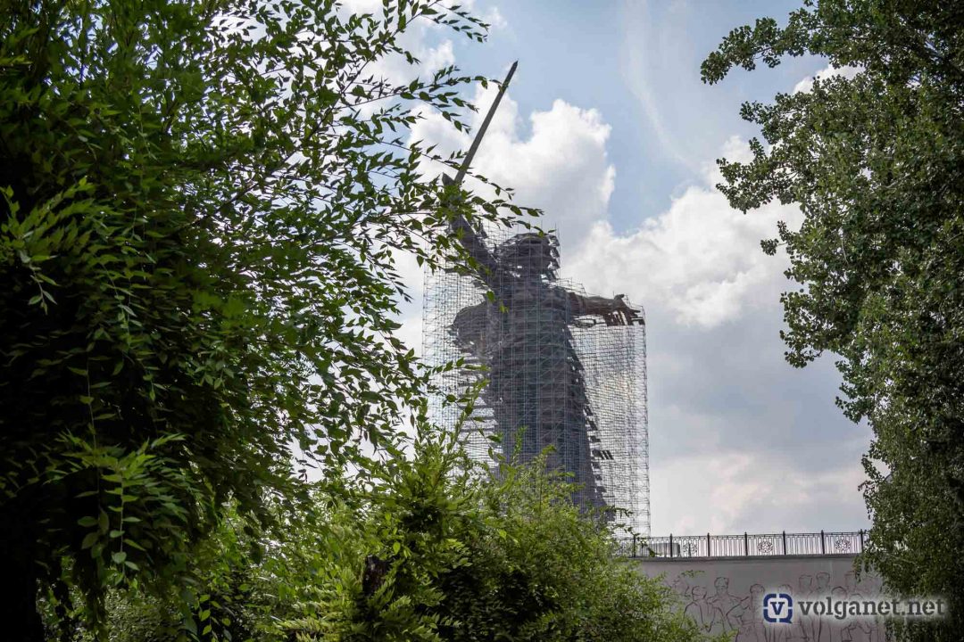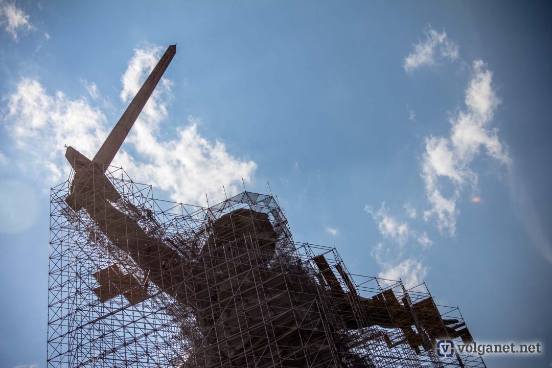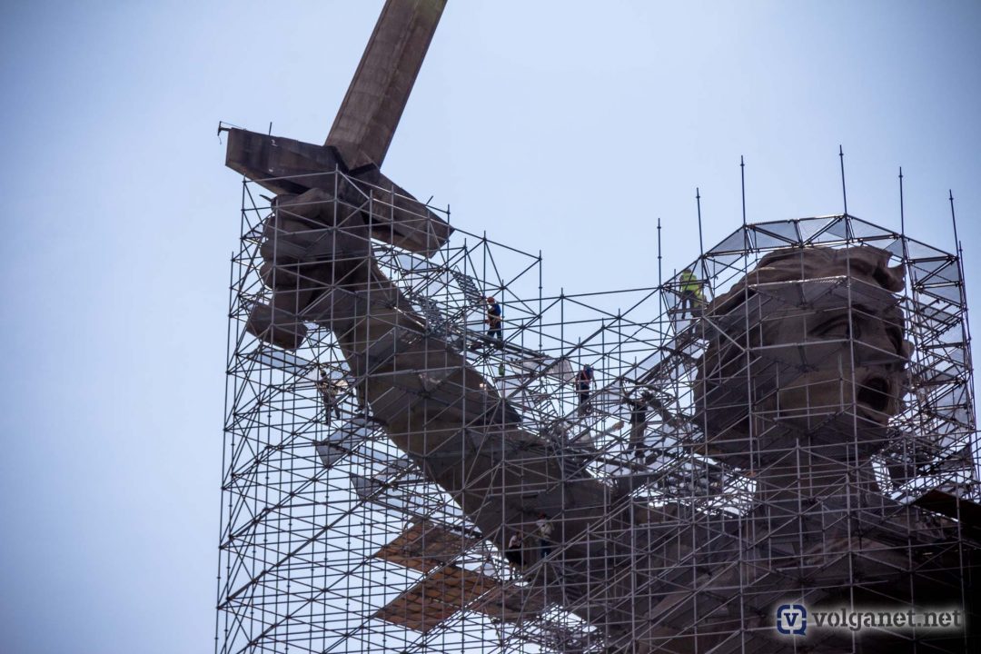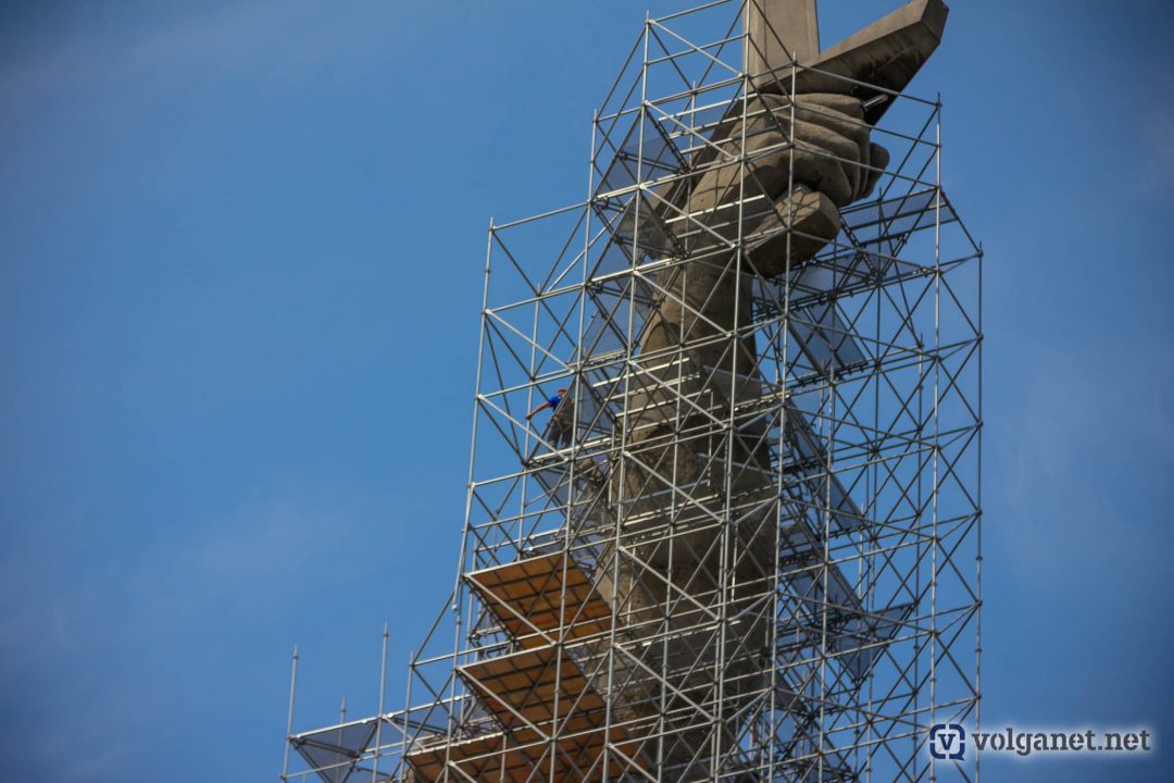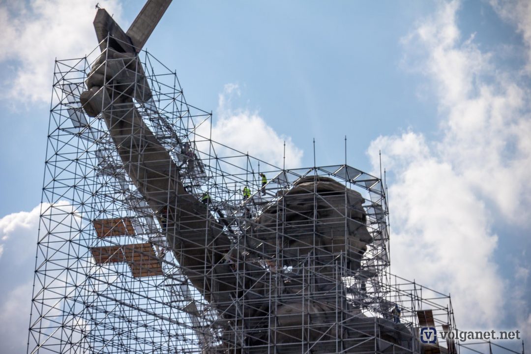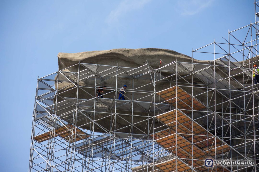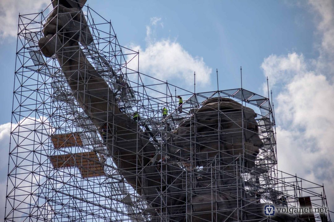 Леса укрыли 52-метровую статую полностью – без железной паутины остался лишь 33-метровый меч. Реставраторы уже приступили к работе – до ноября подрядчику предстоит очистить каждый сантиметр поверхности монумента от полувекового налёта грязи. В итоге Родина-мать посветлеет и станет такой же, какой была 52 года назад.