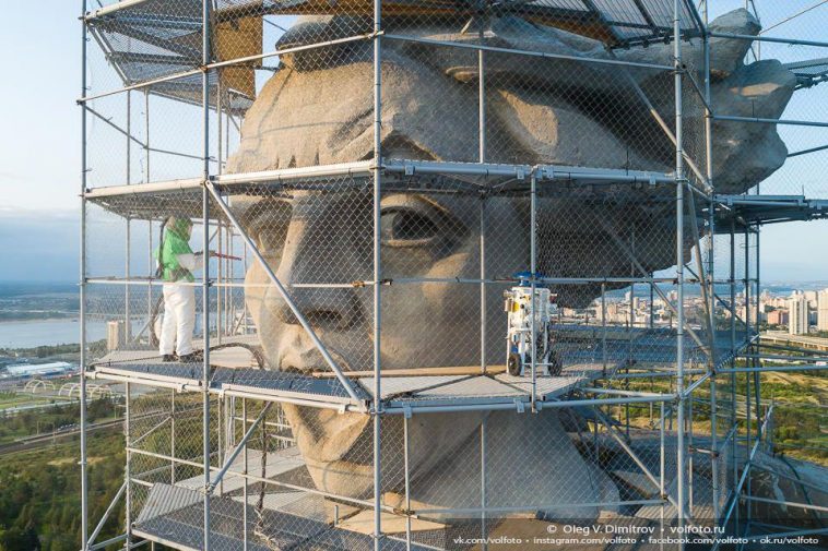Напомним, двумя неделями ранее компания «Главзарубежстрой» завершила монтаж эксклюзивных строительных лесов для монумента «Родина-мать зовёт!», выполненных по спецзаказу и стоимостью 60 миллионов рублей. 52-метровую статую полностью укутали в эксклюзивный наряд – от макушки до пят. Неохваченным остался лишь 33-метровый меч.