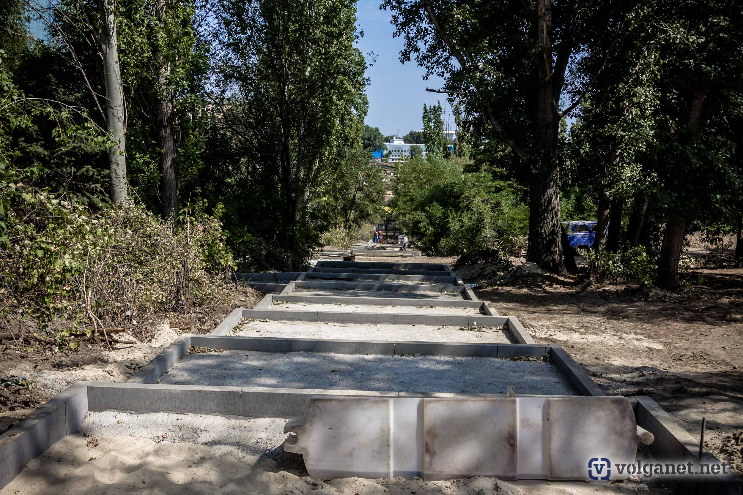 Сейчас строители уже сформировали бетонное основание под новую лестницу, ведущую к Царицынскому парку. Здесь установили бордюры и сформировали песчано-щебёночное основание для будущих пешеходных дорожек.