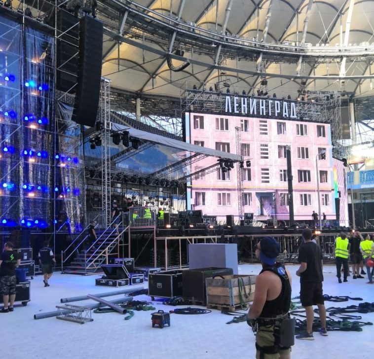 Ещё в выходные в Волгоград приехали 12 фур, которые привезли 70 тонн «железа». Сцена представляет из себя огромный металлический каркас, за ним – задник, на каркасе уже есть надпись «Ленинград». По бокам будут смонтированы два огромных экрана, куда будет выводиться картинка.