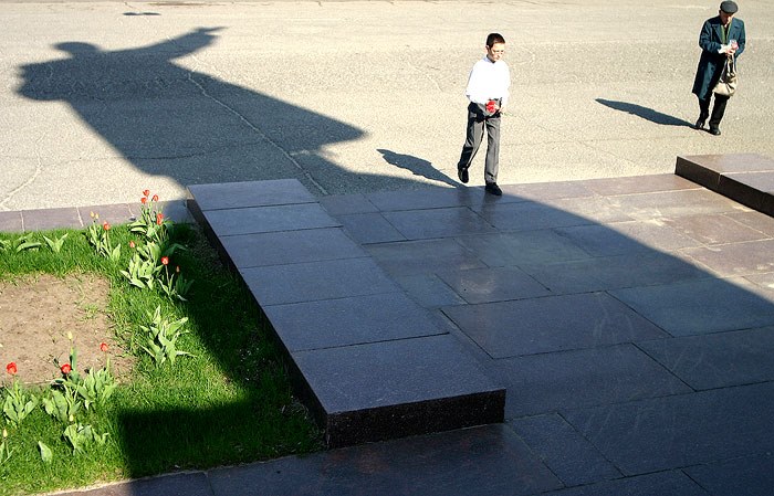 — Одна фотография, которую ты сделал в 2001-м, кажется, году, она произвела ошеломляющее впечатление и на меня, и на знакомых моих. Это просто одна из моих любимых фотографий. На ней Родина-мать, цепь из сотен людей, идущих к ней. Чёрно-белая фотография….
