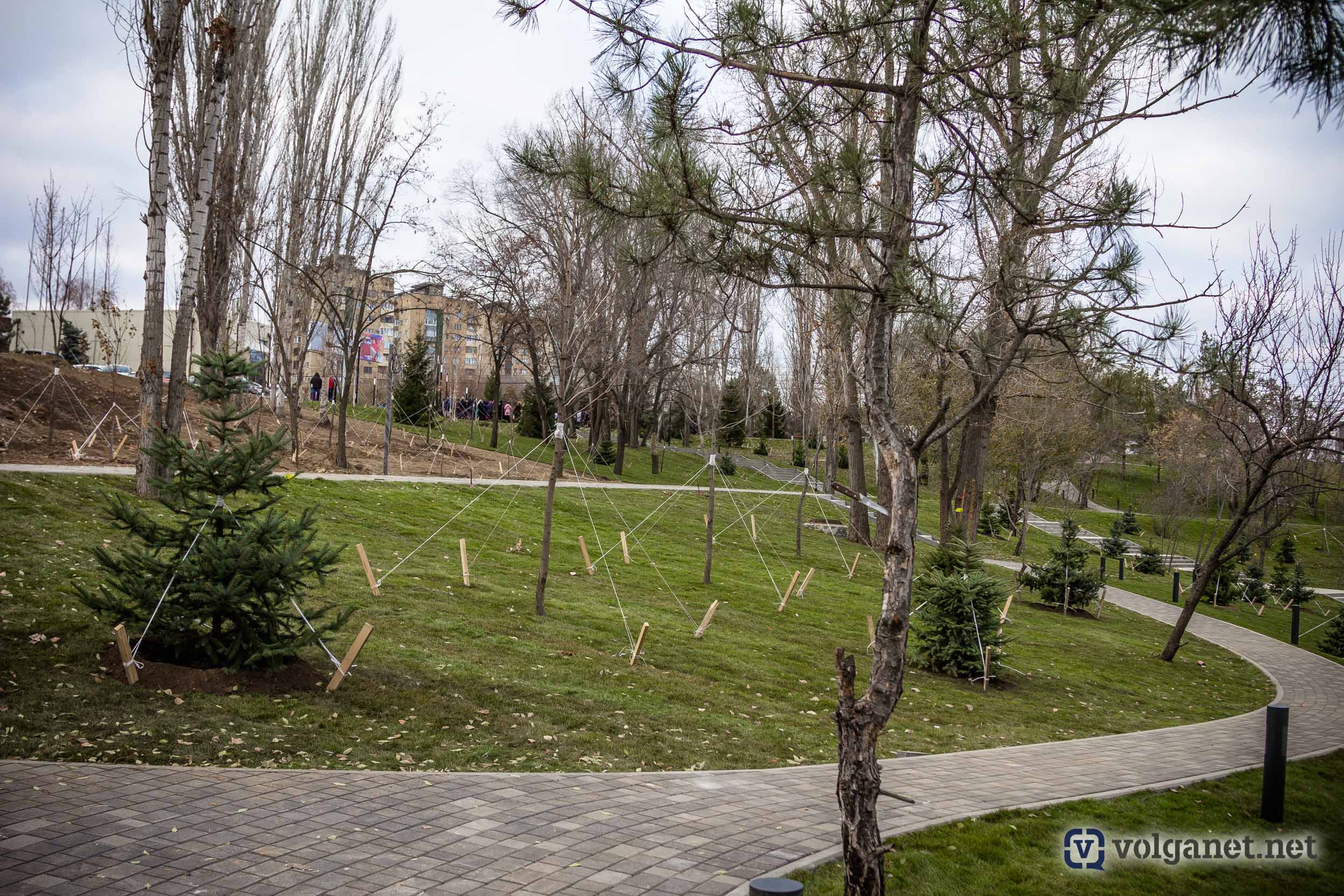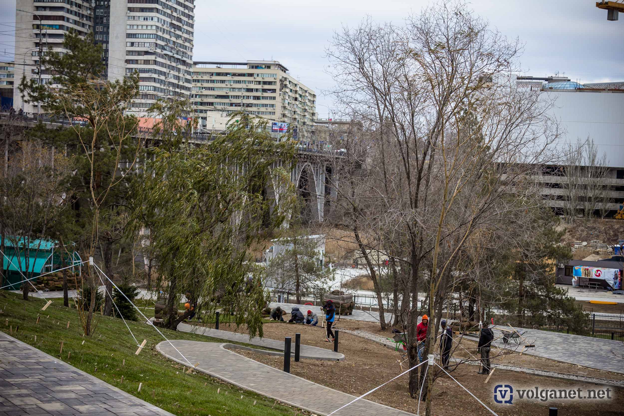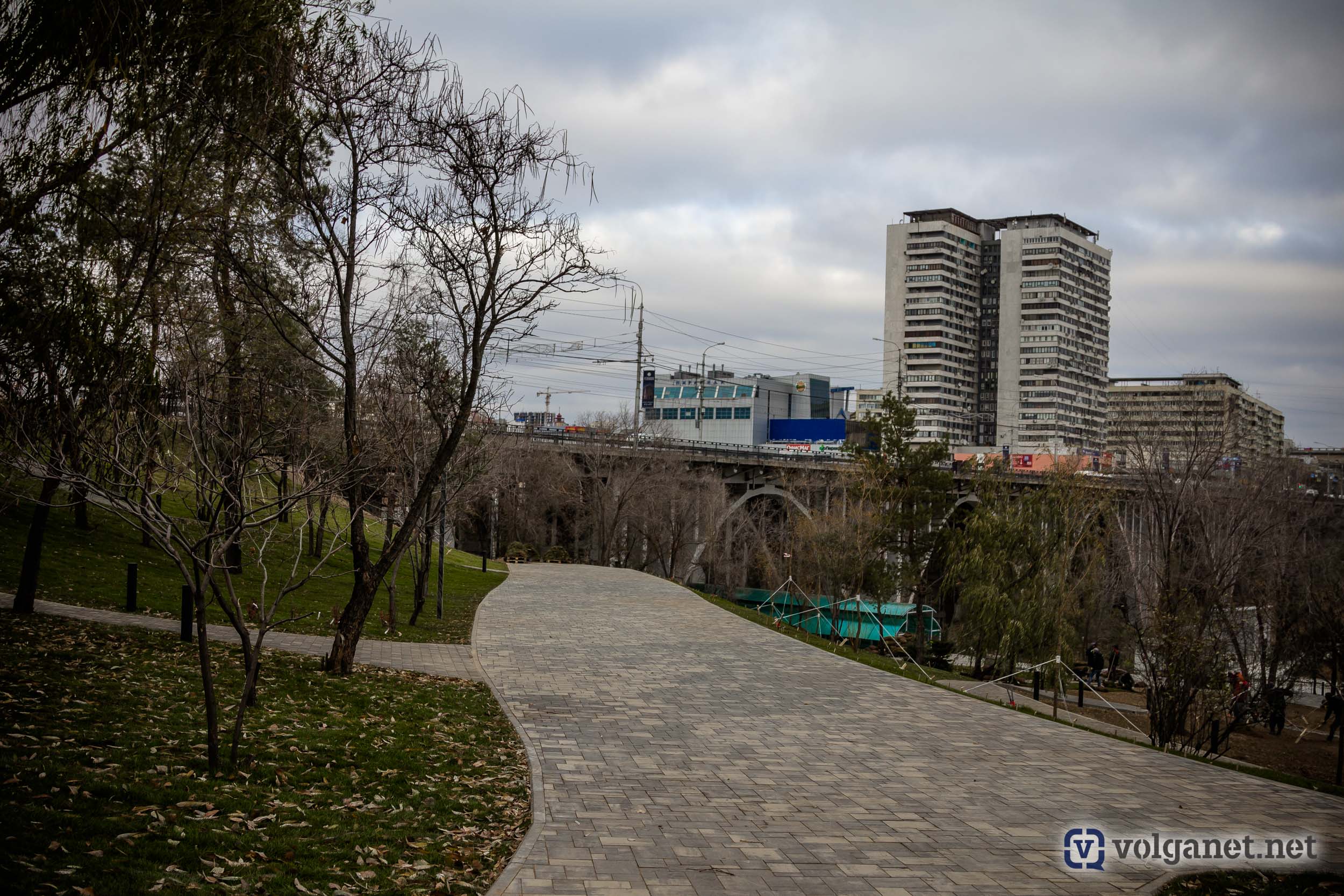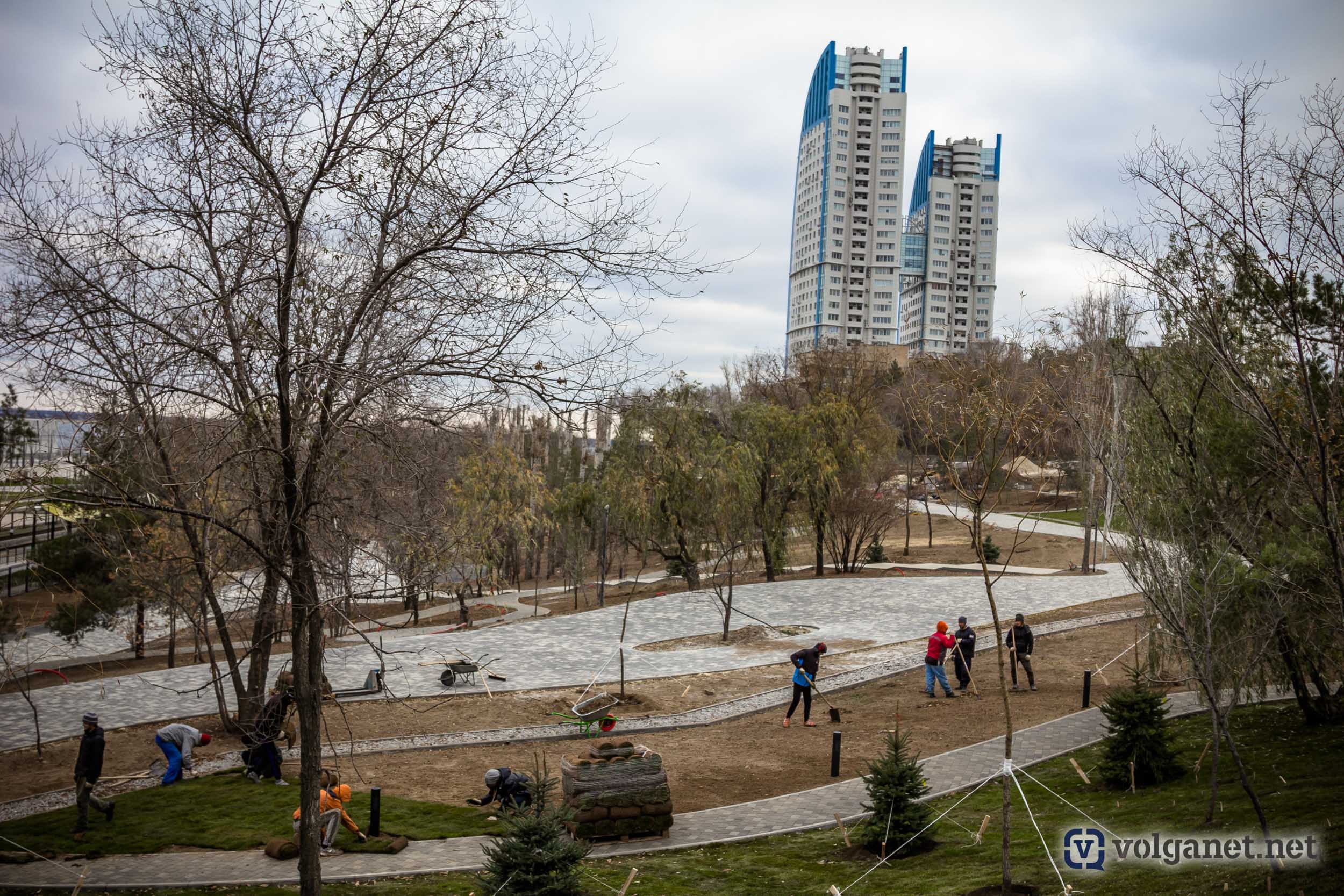 Надо отдать должное, территория на правом склоне реки Царица, раньше пугавшая своей запущенностью, серьёзно преобразилась. Появились пешеходные дорожки, вскоре должны возвести мосты, которые позволят спускаться в пойму, минуя детскую железную дорогу. Один из лестничных сходов будет начинаться из сквера имени Пахмутовой, а второй строители возводят ближе к рокадной дороге.