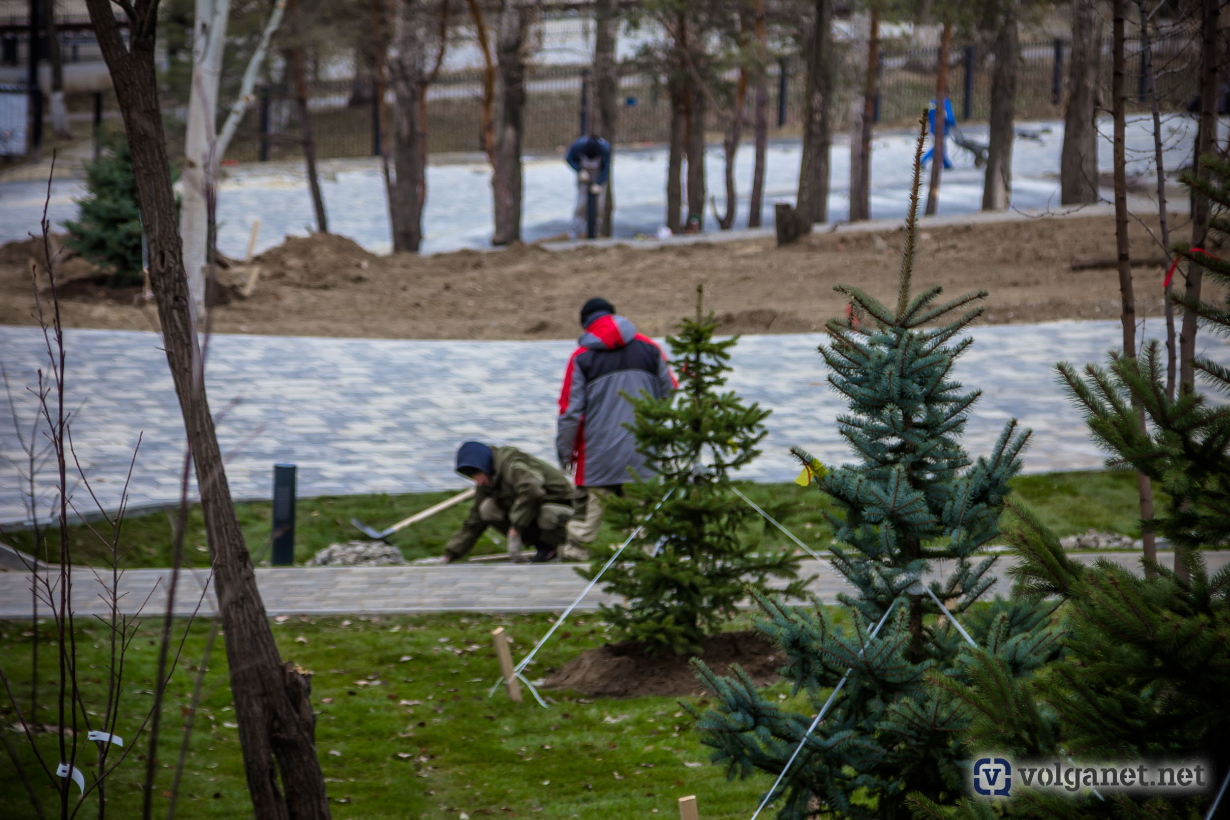 Здесь продолжаются работы по строительству терренкуров – пешеходных дорожек – общей площадью 12 тысяч квадратных метров. Строители укладывают газон и монтируют поливочный водопровод.