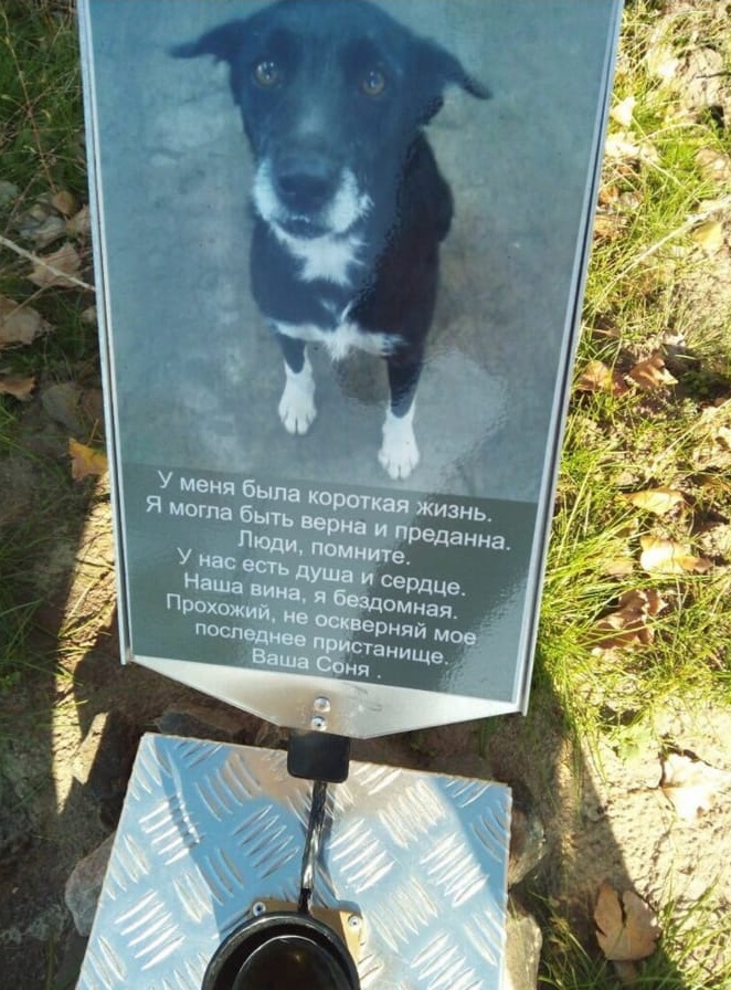 На нём написано: «У меня была короткая жизнь. Я могла быть верна и преданна. Люди, помните. У нас есть душа и сердце. Наша вина. Я бездомная. Прохожий, не оскверняй моё последнее пристанище. Ваша Соня».