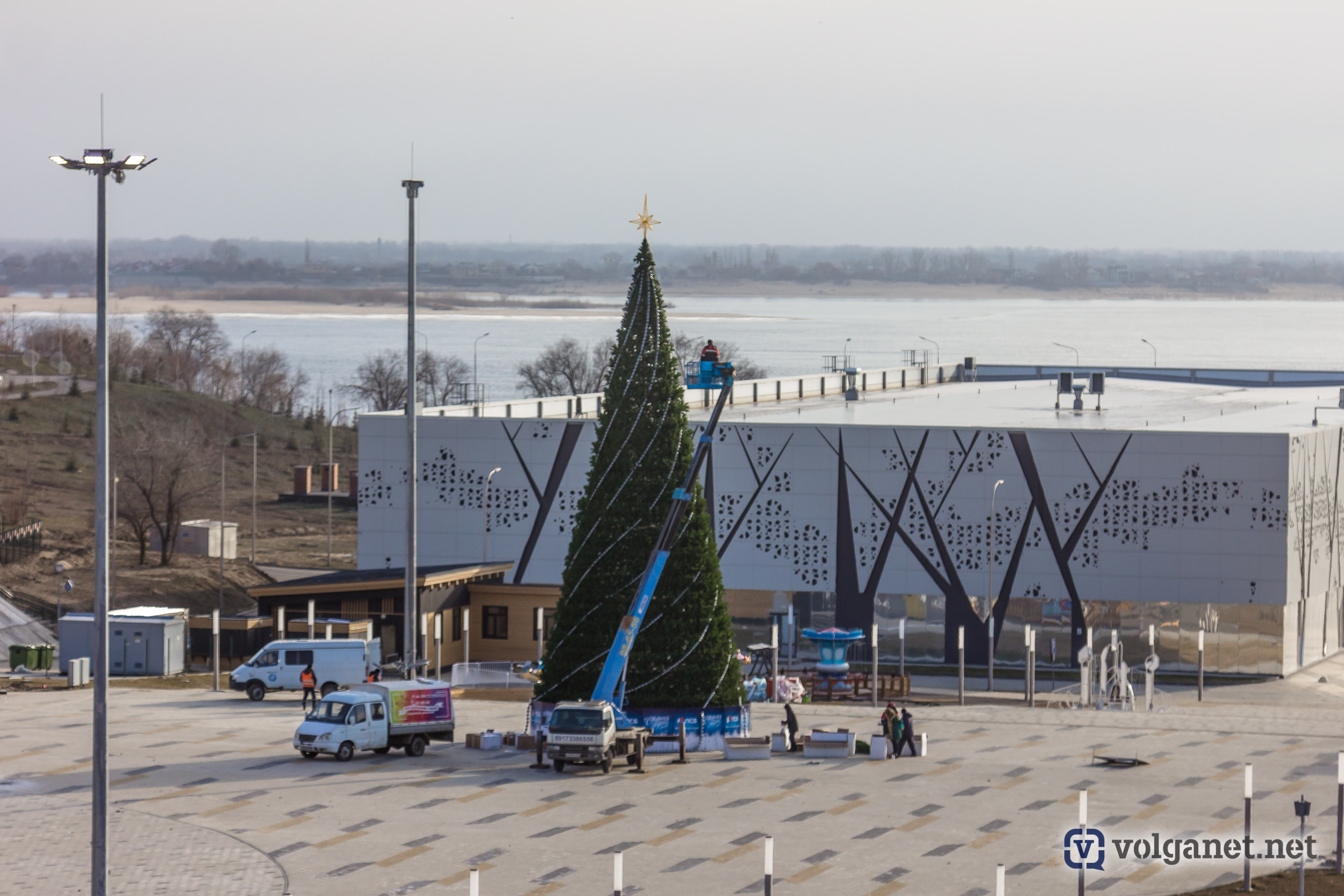 Нарядили в пойме реки Царица и главную ёлку города. Её, как и обещали в мэрии, украсили сотни цветных шаров и светящихся гирлянд.