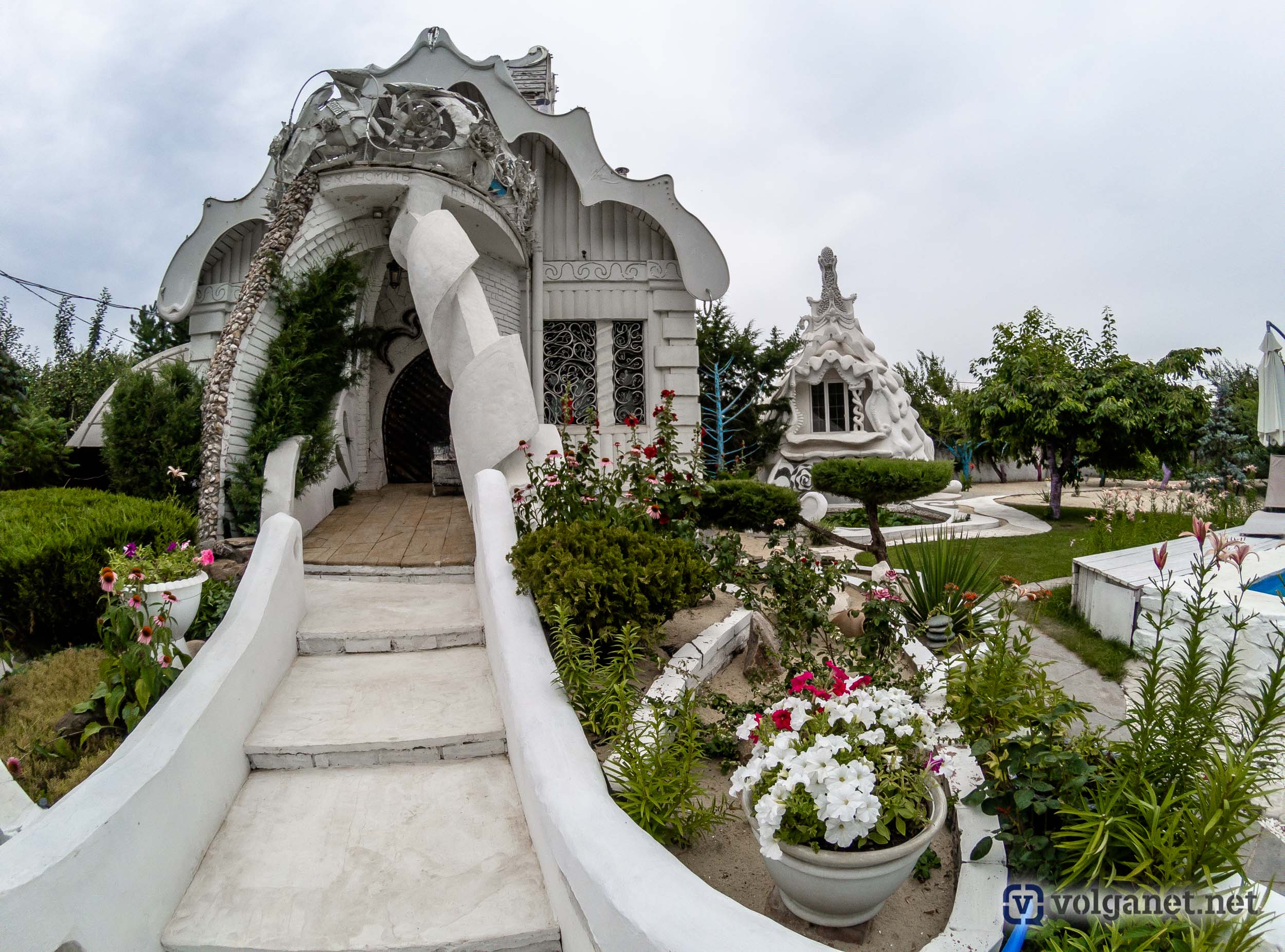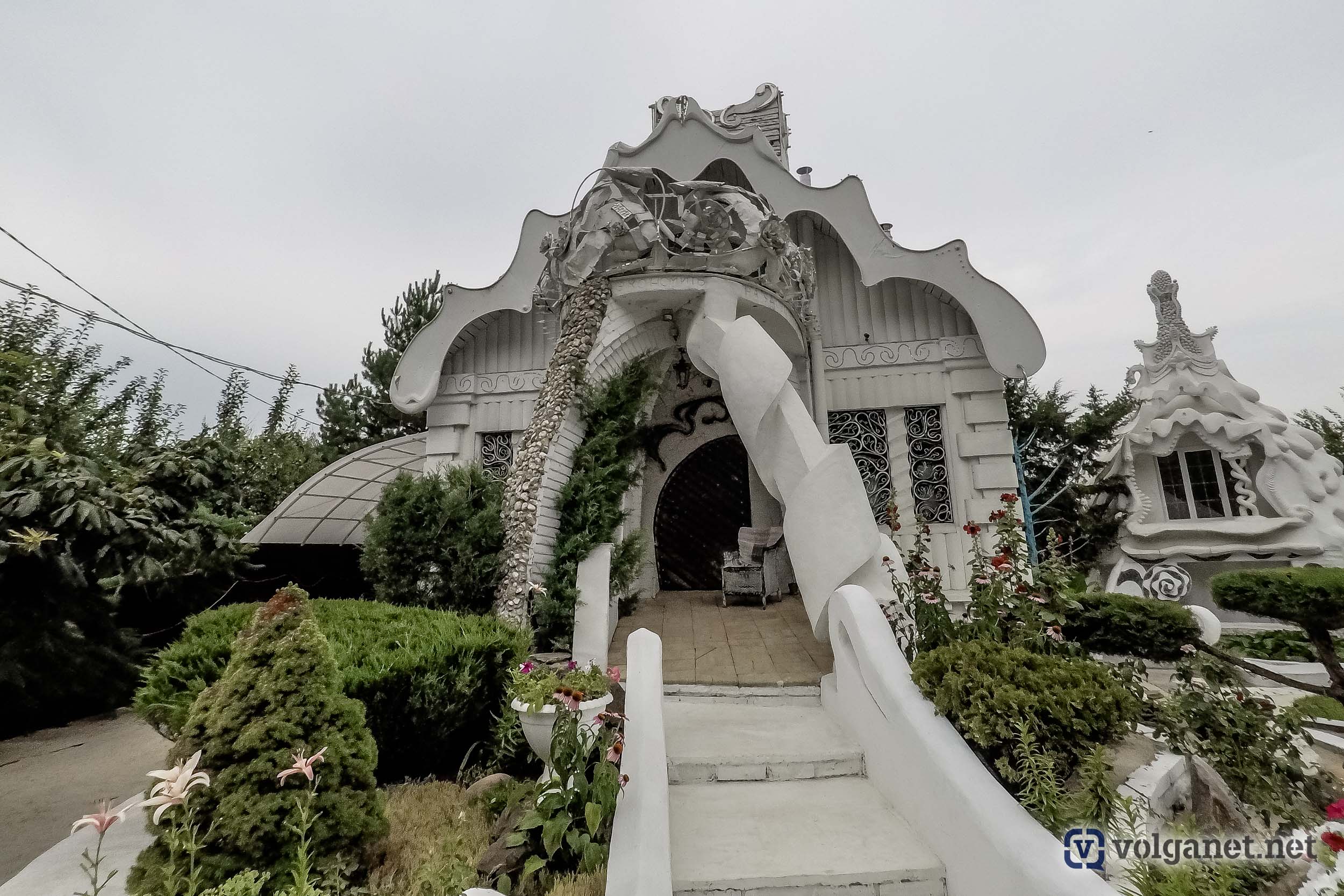 Дом, точнее, замок сделан как будто из зефира и больше похож на произведение кулинара, нежели зодчего. Высокий забор тоже словно вылеплен из мастики, а домик поменьше во дворе (келья, как его называет Валерий) вообще похож на замок из песка, правда, из песка сахарного.