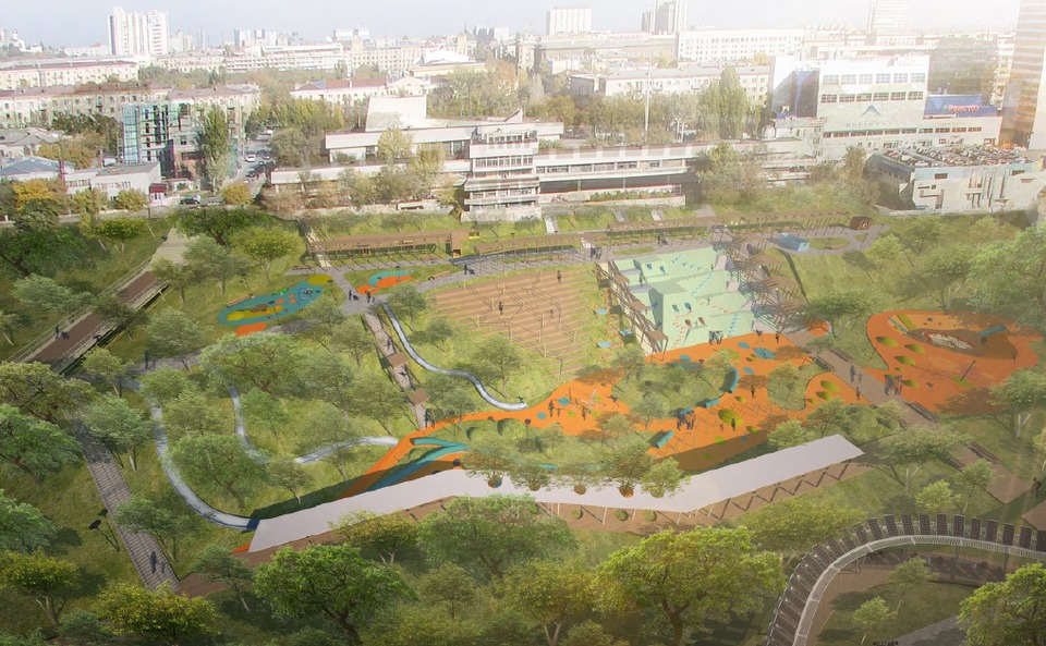 Также архитекторы предложили разделить общественную территорию на четыре функциональные зоны: это парковая часть для прогулок, спортивный блок с аквапарком для активного отдыха, а также лаунж-зоны и арт-объекты.