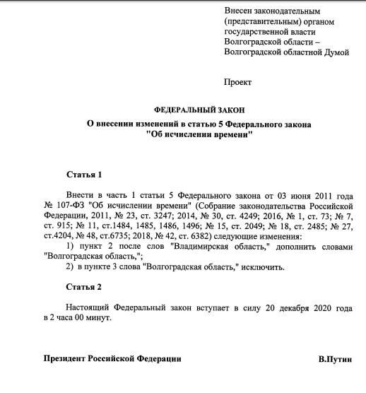 Сообщение о том, что документ направили на утверждение депутатам Госдумы и на подпись Президенту Владимиру Путину, пришло из Волгоградской облдумы. На своём портале регпарламент разместил и сам законопроект.