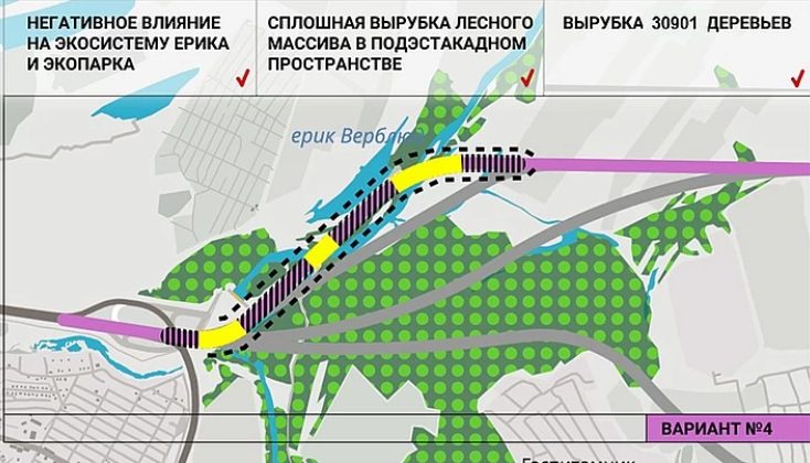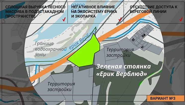 Третий вариант предполагает прохождение автотрассы по левому берегу ерика Верблюд. Но из-за рельефа местности строителям пришлось бы возвести 2-километровую эстакаду, что потребовало бы сплошной рубки деревьев. Кроме того, это вызвало бы изменение руслового ложа и береговой линии и нанесло бы непоправимый ущерб водной экосистеме.