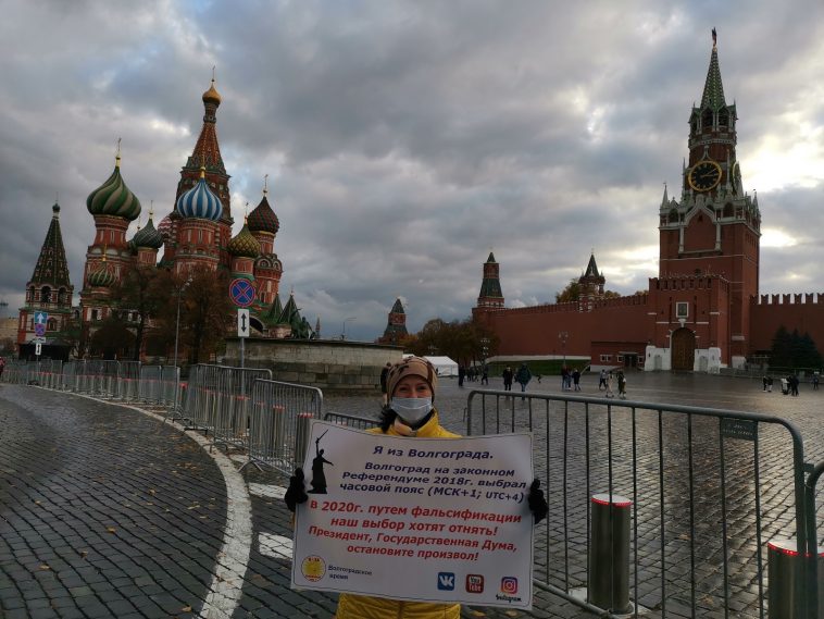 5 ноября в Москве на Красной площади волгоградские активисты, ратующие за местное время, устроили серию одиночных пикетов. Они развернули плакаты с требованиями оставить волгоградское время.