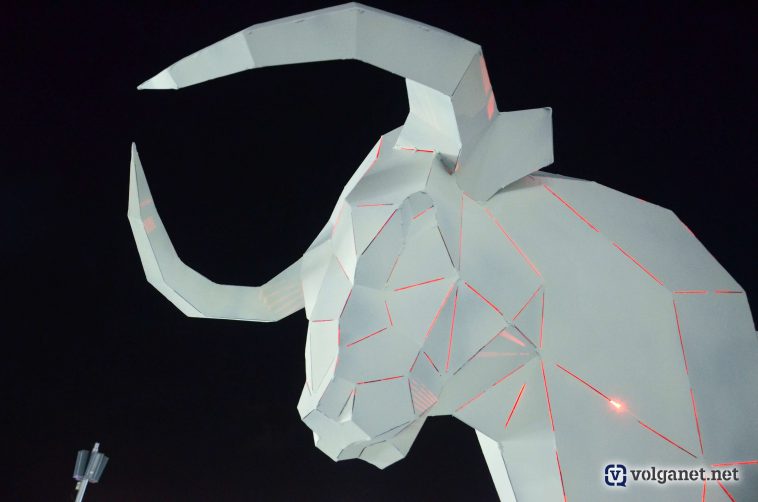 Белоснежный бык встречает посетителей в парке «Раздолье» в пойме реки Царицы. Главный символ года установили за неделю до празднований.