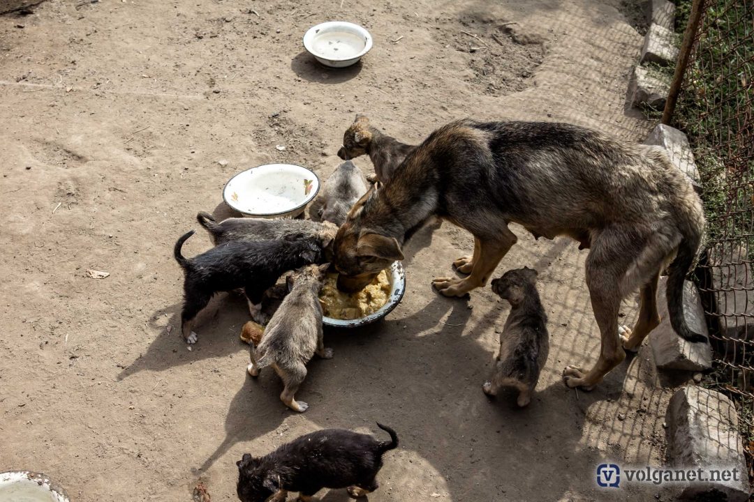 Здание приюта находится почти на самом берегу Волги, вид и воздух здесь потрясающие. А ещё звуки! Звуки деревни и тишины. Собака со щенками, кролики в клетках, лавочки под виноградными плетями… пастораль, одним словом. Кто-то из бездомных живёт здесь уже два года, другие мечтают вернуться домой.