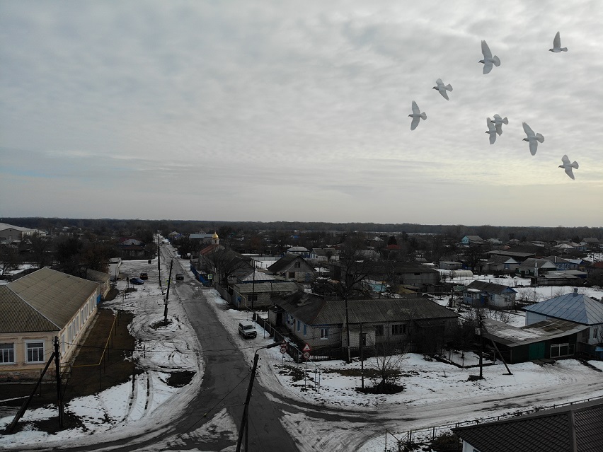 Погода в Глазуновской стояла удивительная. Белые голуби, увидев квадрокоптер, решили поближе познакомиться со странным летающим существом. У памятного камня собралось полтора десятка человек – волгоградцы, иловлинцы и несколько местных.