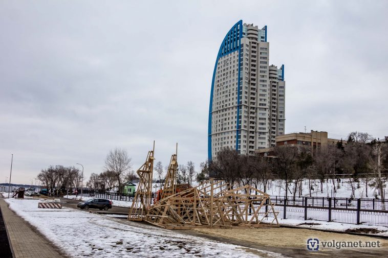 А Волгоград в этом году может заполучить ещё и рекорд, установив самое высокое в России (на сегодняшний день) чучело Масленицы. Процесс сбора огромной конструкции попал в объектив камеры фотокора Volganet.net.