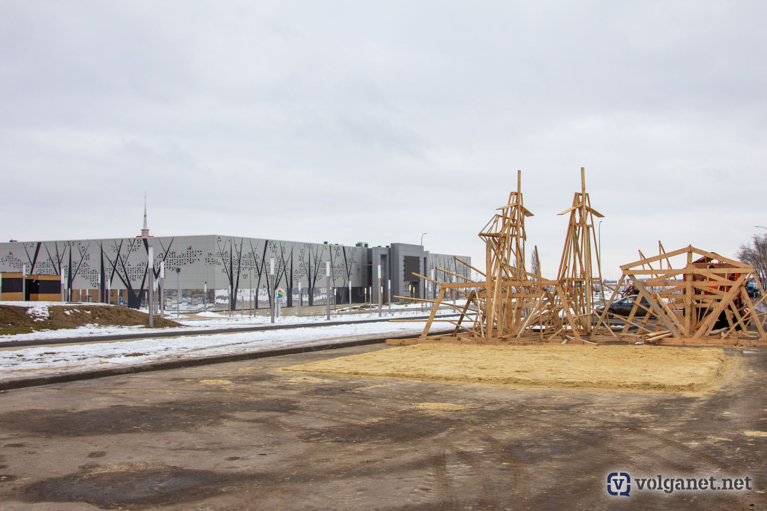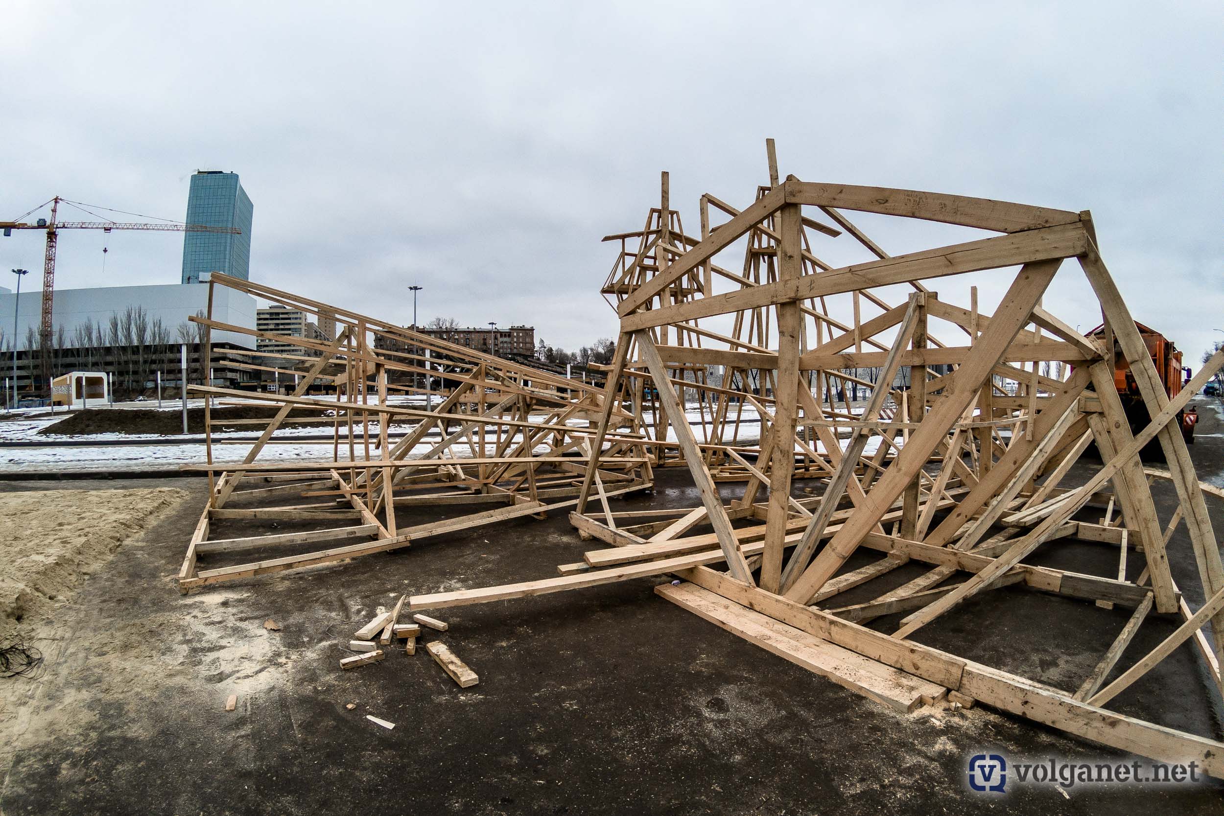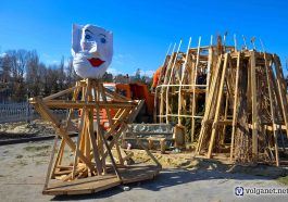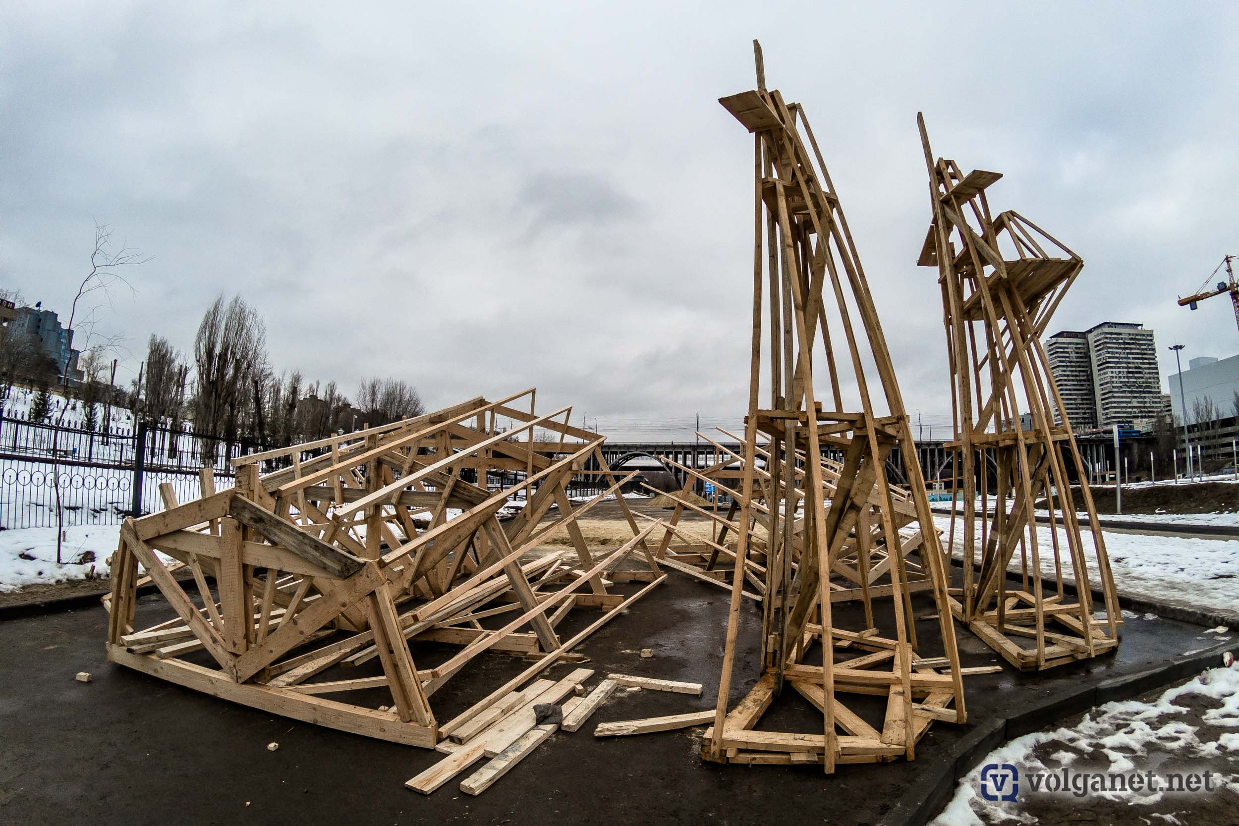 А Волгоград в этом году может заполучить ещё и рекорд, установив самое высокое в России (на сегодняшний день) чучело Масленицы. Процесс сбора огромной конструкции попал в объектив камеры фотокора Volganet.net.