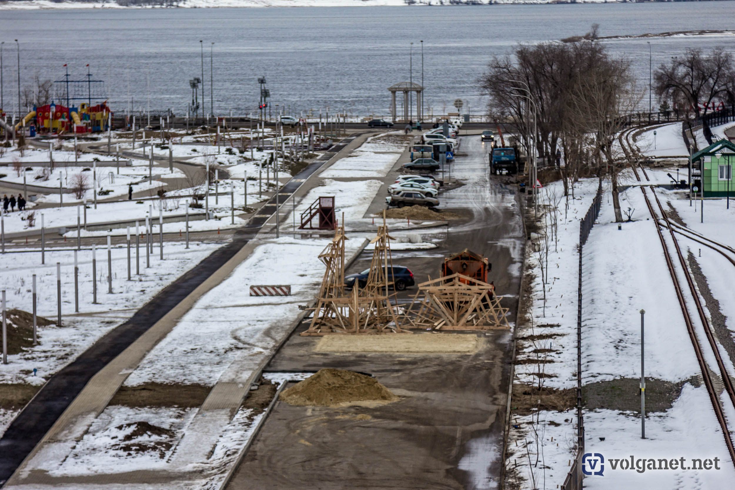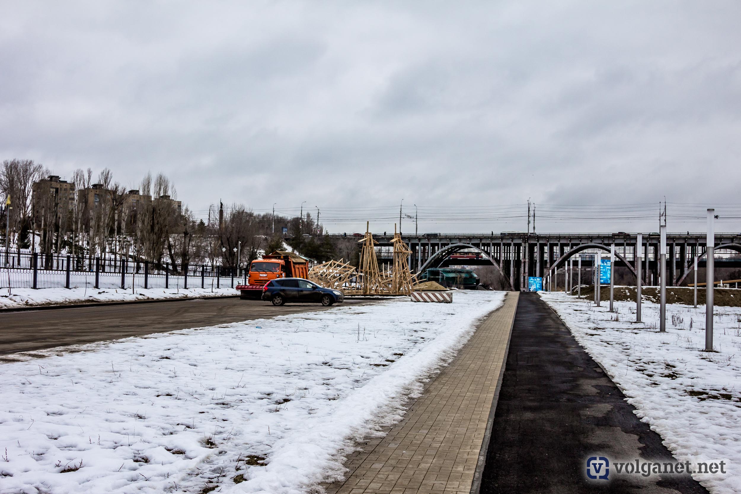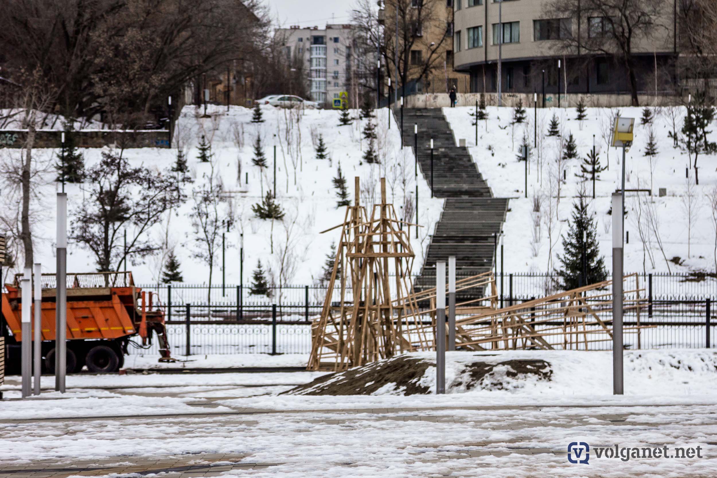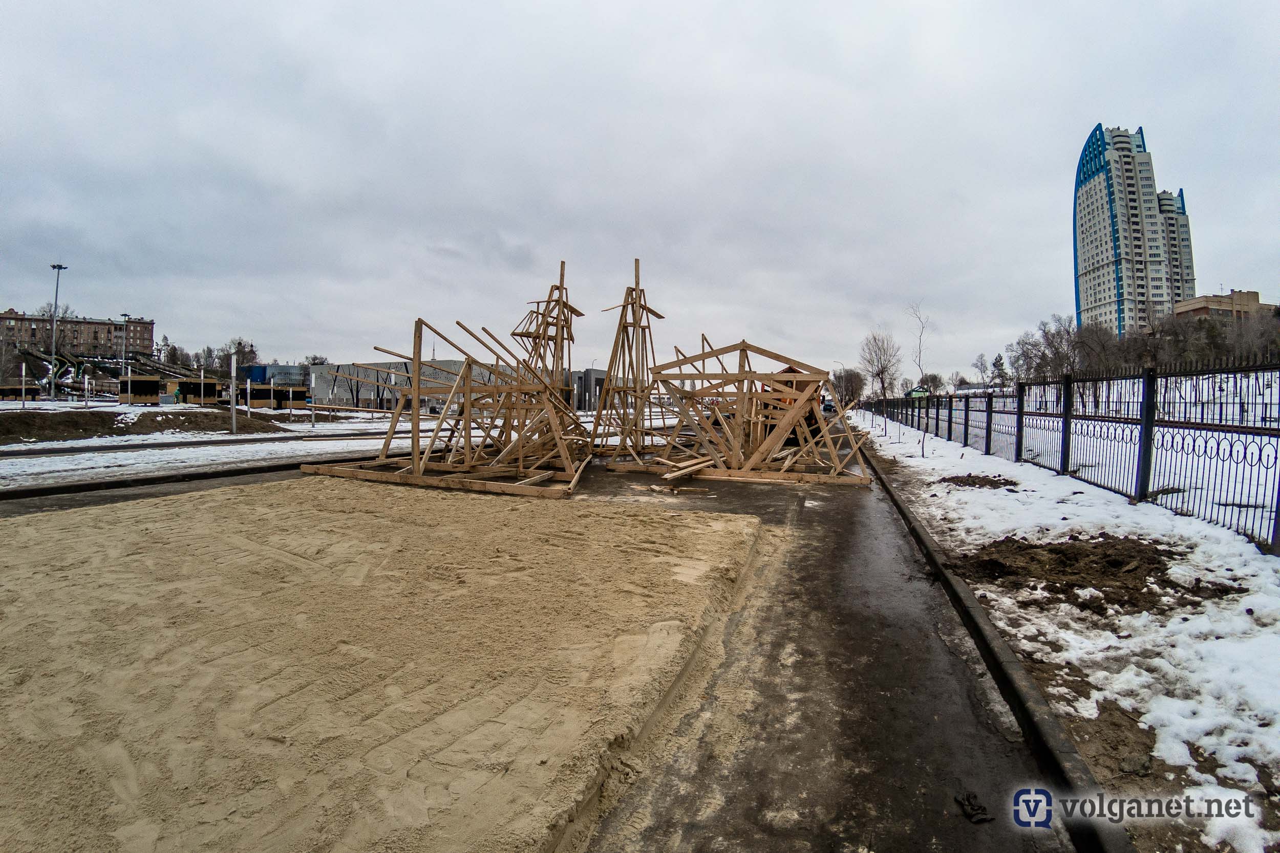 А Волгоград в этом году может заполучить ещё и рекорд, установив самое высокое в России (на сегодняшний день) чучело Масленицы. Процесс сбора огромной конструкции попал в объектив камеры фотокора Volganet.net.