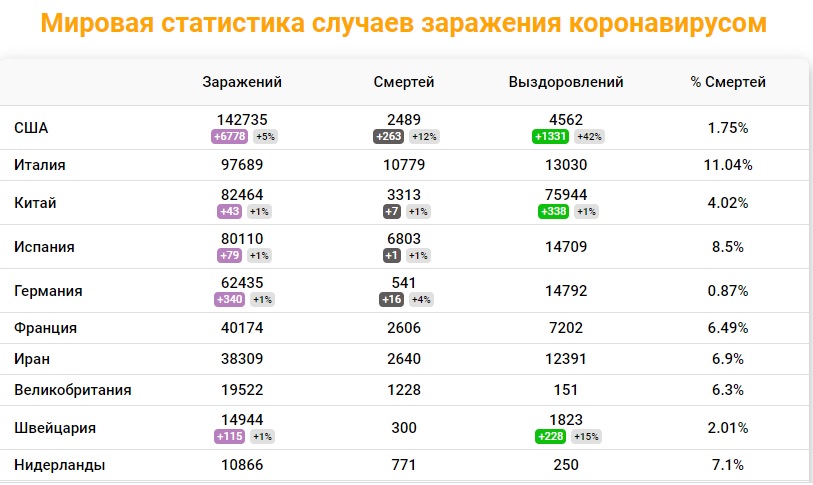 Самое большое число заболевших на сегодняшний день зафиксировано в Америке – 142735, только за последние сутки число смертей выросло на 263.