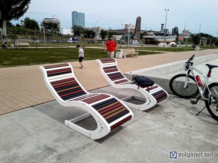 В Волгограде на берегу Волги, неподалёку от легендарного «Гасителя», ещё в прошлом году разбили сквер. Сквер, к слову сказать, необычный – с шезлонгами, интересной формы лавочками и навесами. «Осенние» шезлонги были с металлическими основаниями, весной к ним добавили похожие – деревянные – и столы для шахмат. Но, увы и ах, мебель для отдыха не простояла и пары месяцев.
