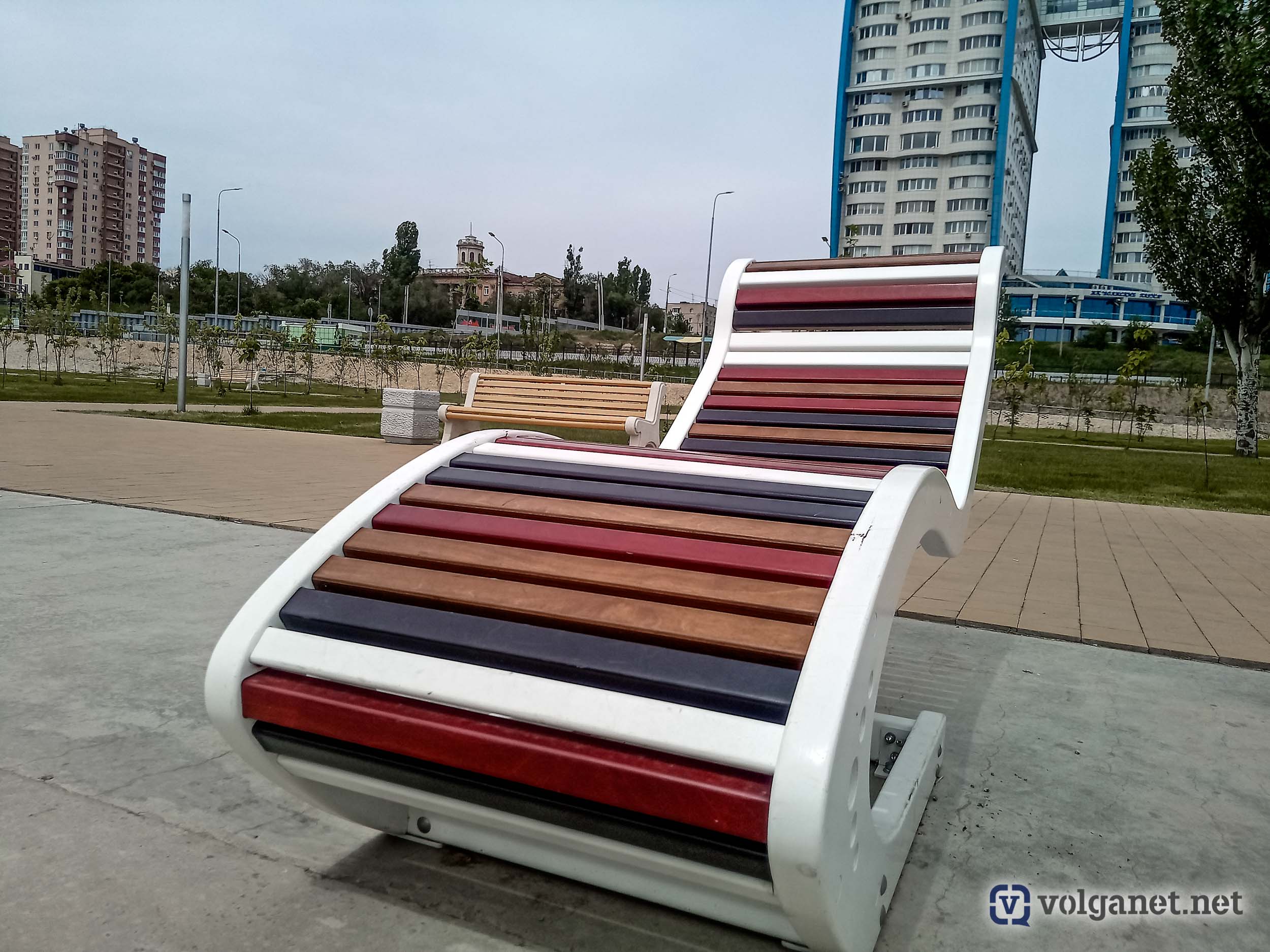 В Волгограде на берегу Волги, неподалёку от легендарного «Гасителя», ещё в прошлом году разбили сквер. Сквер, к слову сказать, необычный – с шезлонгами, интересной формы лавочками и навесами. «Осенние» шезлонги были с металлическими основаниями, весной к ним добавили похожие – деревянные – и столы для шахмат. Но, увы и ах, мебель для отдыха не простояла и пары месяцев.