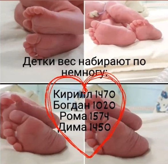 Кстати, все малыши уже существенно прибавили в весе. Рома весит 1547 граммов, Кирилл – 1470, Дима – 1450, а самый маленький Богдан – 1020 граммов.