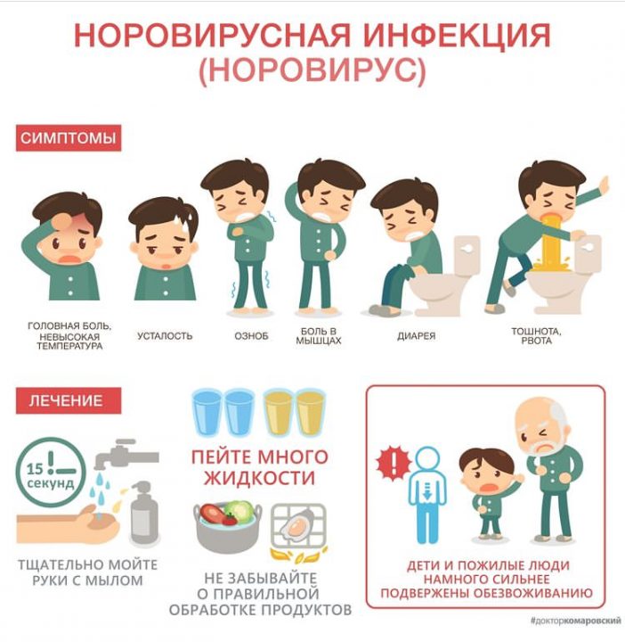— Инкубационный (скрытый) период норовируса составляет от нескольких часов до двух суток. Заболевание проявляется в виде тошноты, рвоты, диареи до 8 раз в сутки, незначительного повышения температуры тела, симптомов интоксикации, проявляющихся общей слабостью и бледностью кожных покровов. Самочувствие нормализуется в течение нескольких дней, но человек может быть заразен до 1 месяца после выздоровления, что и обуславливает активное заражение окружающих и эпидемическую опасность, — сообщил доктор Комаровский.