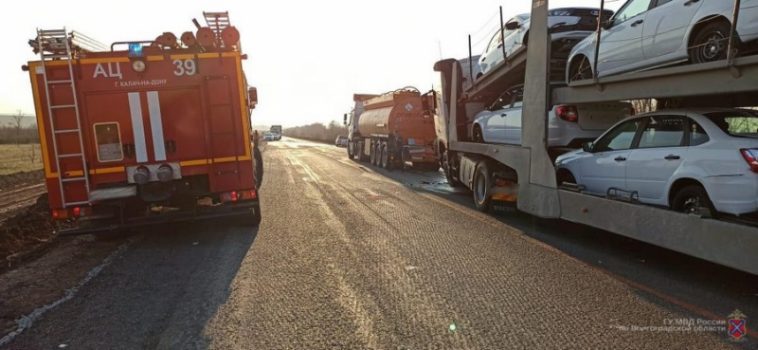 — По предварительной информации, на участке ремонтных работ перед светофором остановился бензовоз, за ним — «Лада Калина» с номерами Ростовской области. За «Калиной» встал автовоз «Вольво». Предполагаемым виновником ДТП стал водитель автомобиля «МАН», который следовал за автовозом и не успел затормозить. Он влетел в «Вольво», автовоз – в «Калину», та, в свою очередь, столкнулась с бензовозом. Удар был такой силы, что легковушку буквально расплющило между двумя большегрузами, — уточнили в Главке.