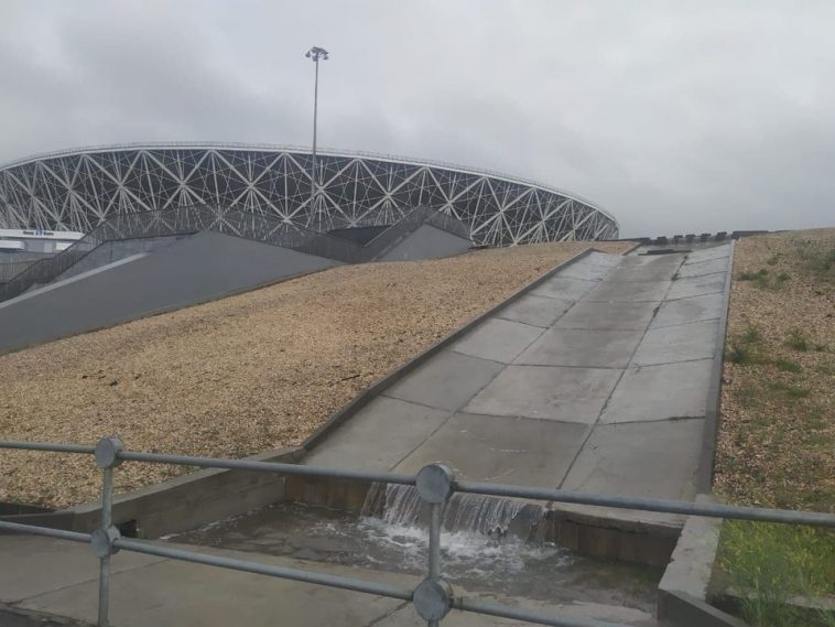На кадрах прекрасно видно, как потоки воды стекают по специально разработанной системе стоков в канализацию, при этом весь щебень остается на месте. И это радует, потому что учитывая, в каком состоянии находится весь остальной город, только «заплыва» стадиона нам не хватало для полного счастья.
