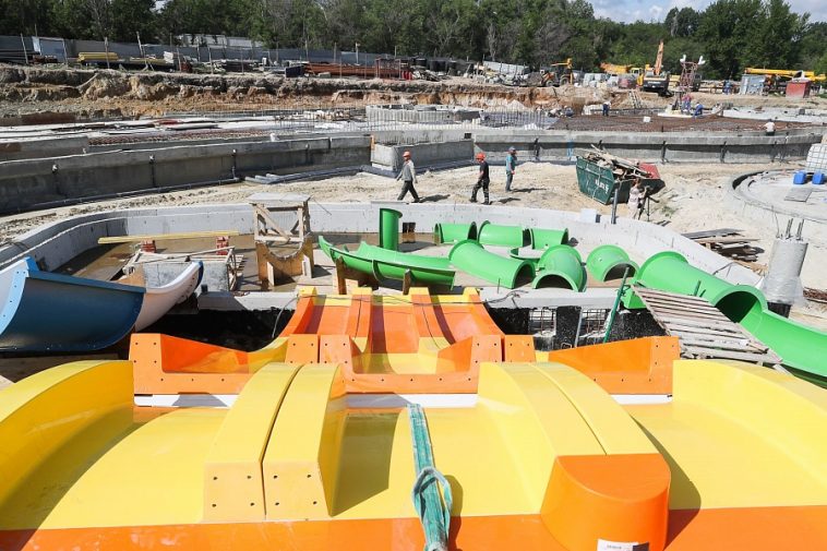 В эти дни на стройплощадке кипит работа – подрядчик намерен сдать объект в эксплуатацию уже в конце июля. Сейчас единовременно в работах задействованы свыше 100 человек и 20 единиц техники. На сегодняшний день специалистами частично завершены работы по прокладке под землёй 17 км инженерных сетей, устройству чаш бассейнов, ведётся монтаж опорных площадок под конструкции водных горок и аттракционов.