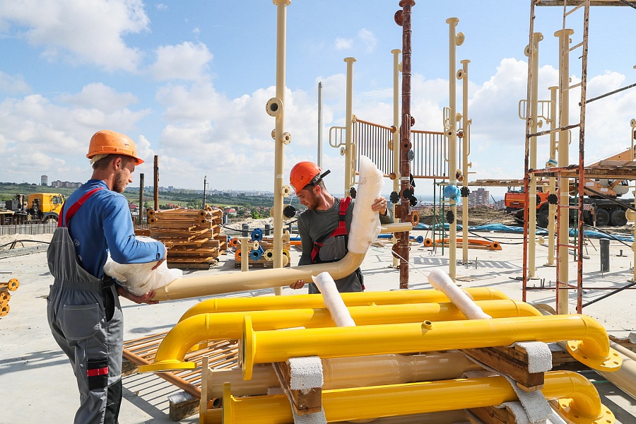 Работы проводятся на участках строительства детского, подросткового, волнового бассейнов и аттракциона «Медленная река». Также строительные бригады на 90% завершили работы по монтажу наружных сэндвич-панелей административно-бытового комплекса, приступили к внутренней отделке помещений и благоустройству территории.