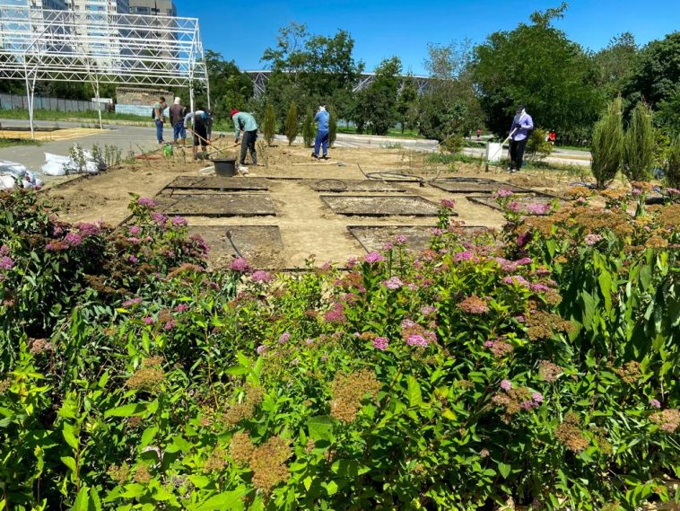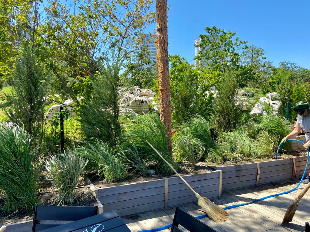 По словам директора ЦПКиО Андрея Еркина, обустройство водного комплекса идёт параллельно с озеленением территории. В парке уже посадили кусты, разнотравье, порядка 250 деревьев и разбили розарии. Чтобы ухаживать за зелеными насаждениями, в парке обустроили поливочный водопровод.
