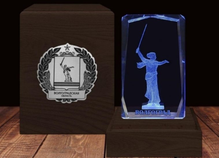 Сувенир будет выполнен из стекла в виде параллелепипеда с трёхмерным изображением Родины-матери внутри. Свечение скульптуры синим цветом обеспечит светодиодная подсветка, которую можно будет включать и выключать. К слову, подсветка копирует ту, что используется во время проведения акции «Свет Великой Победы» — лазерного шоу на Мамаевом кургане.