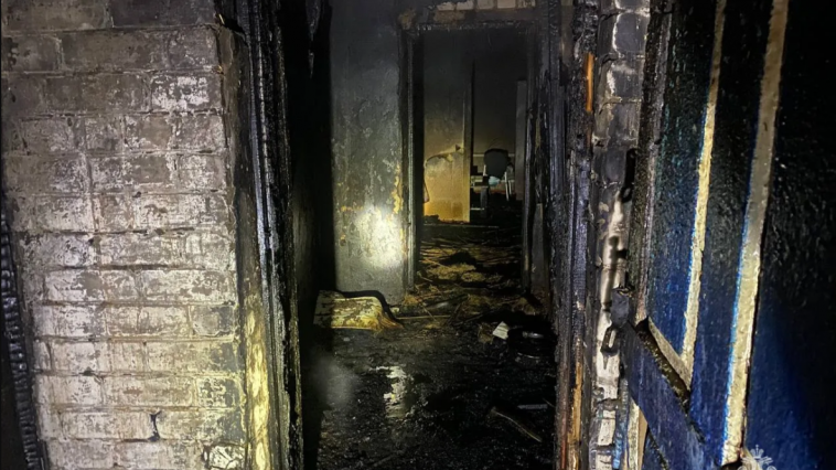 Из обгоревшего двухэтажного дома с отваливающимися кирпичами выходит женщина в халате – развешивает выстиранное белье. Оконные стёкла второго этажа потрескались и вот-вот рухнут на землю. На фасаде здания синей краской большими буквами написано: «Будьте внимательны!!!»