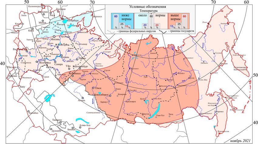 Итак, метеорологи говорят, что ноябрь будет в нашем регионе вполне обычным, ну, может, немного морознее обычного. На карте наш регион выделен розовым цветом, а это значит, что мы в норме, пусть даже у верхней её границы. Если смотреть на прошлогодние показатели, то средняя температура в последний месяц осени в Волгоградской области составляет около 4°С.