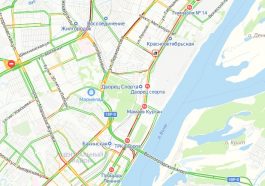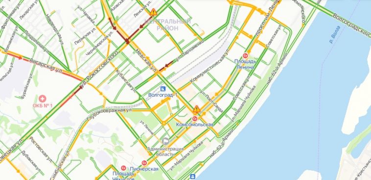 Большая часть дорог подсвечена жёлтым цветом, часть – красным, что говорит о заторах.