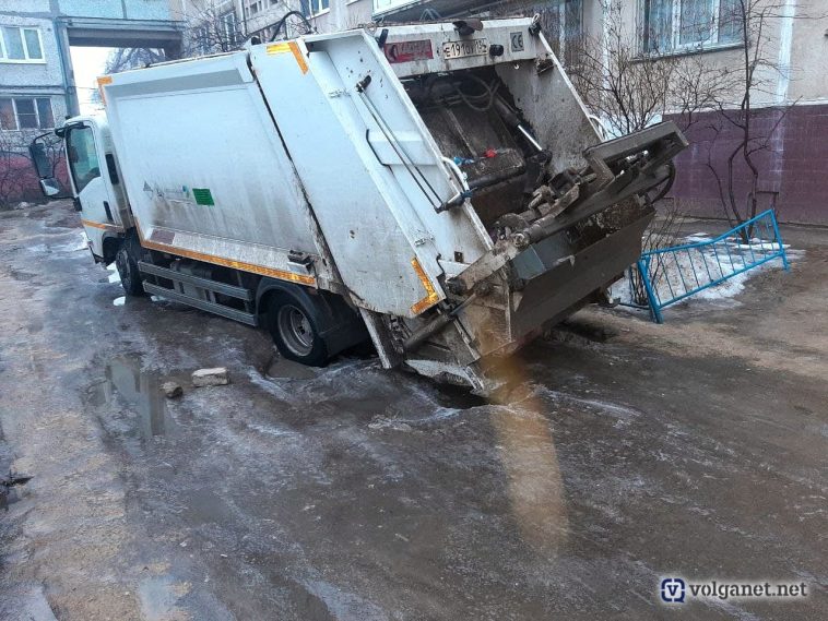 В одном из дворов Ворошиловского района на дороге застряла машина, занимающаяся вывозом мусора. Двор по улице Ростовской за всю зиму ни разу не чистили ото льда, поэтому на дороге образовались настоящие ледяные торосы и ямы. В них и угодил спецгрузовик – проезд по двору оказался перекрыт.