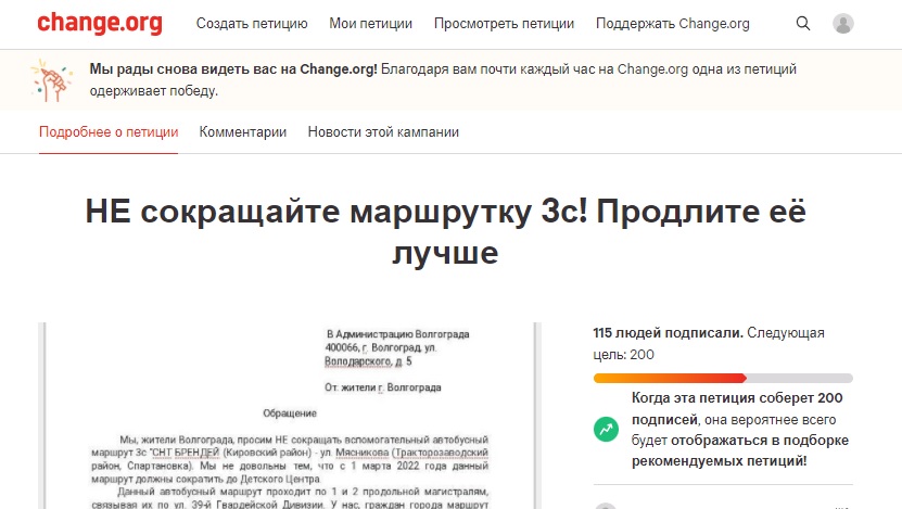 На популярной платформе гражданских инициатив волгоградцы разместили петицию, требующую оставить в покое маршрутку №3с.