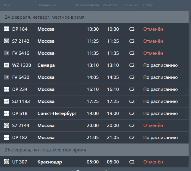 Уже к 10.00 авиакомпании действительно начали отменять рейсы, не рискуя поднимать самолёты в воздух. В частности, свои вылеты отменили авиакомпании S7, «Победа» и «Россия». На сайте S7 говорится, что все рейсы в город-герой Волгоград 24 февраля аннулируются «в связи с ограничением полётов со стороны российских властей».