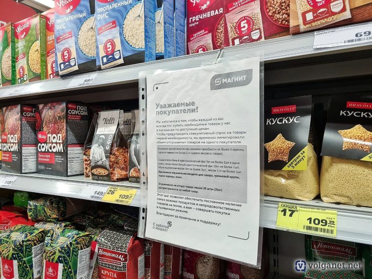 К примеру, магазины сети «Магнит» не продают в одни руки более 5 единиц или 5 кг сахара, гречневой крупы, тушки курицы и муки. Для остальных товаров действует ограничение в 20 штук или 20 кг в одни руки.