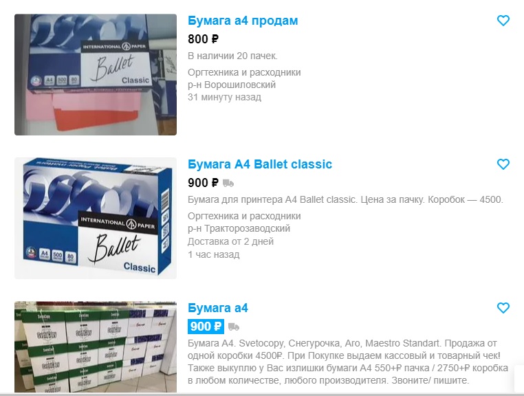 Между тем, предприимчивые волгоградцы на волне очередного ажиотажа снимают пенки или, проще говоря, занимаются спекуляцией. На сайте бесплатных объявлений появилась масса предложений купить бумагу. Цена – от 800-900 рублей за пачку в 500 листов.