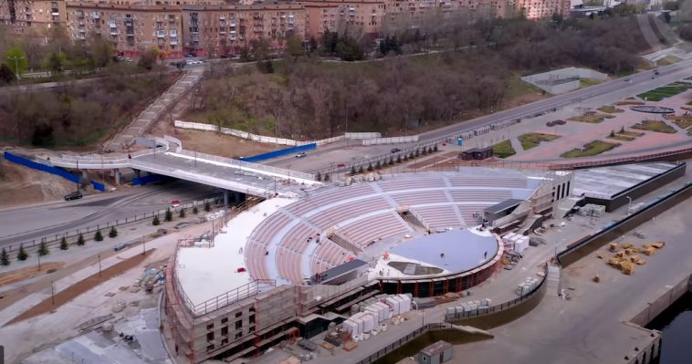 И, самое главное, продолжается строительство главного элемента набережной – открытого амфитеатра на 2300 посадочных мест, к которому ведёт мостовой пешеходный переход через проезжую часть рокадной дороги.