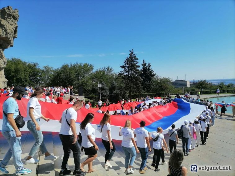 С раннего утра на главную высоту России подтягивались люди – волонтёры, молодёжь, сотрудники федеральных ведомств и обычные жители и гости города. Ровно в 10 часов утра здесь начался флешмоб «Флаг России»: на ступенях между стен-руин волгоградцы развернули восьмидесятиметровое полотно российского триколора.