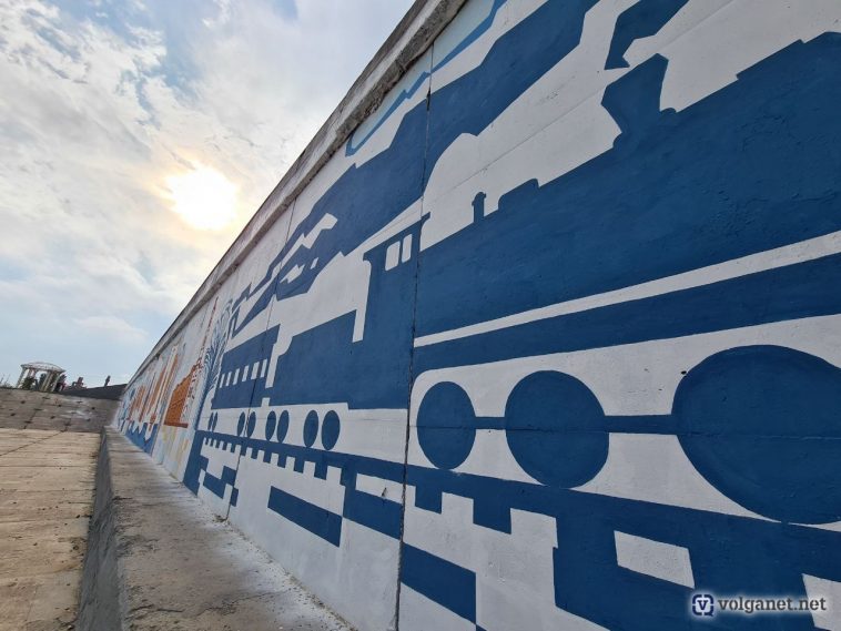 Перед тем, как за кисти и краски взялись студенты, над объектом поработали волгоградские коммунальщики. Не секрет, что раньше подпорные стенки набережной регулярно «украшались» неприличными надписями и картинками художников-любителей. И назвать эти художества произведениями искусства язык не поворачивался. Коммунальные службы Волгограда закрасили «наскальную живопись».