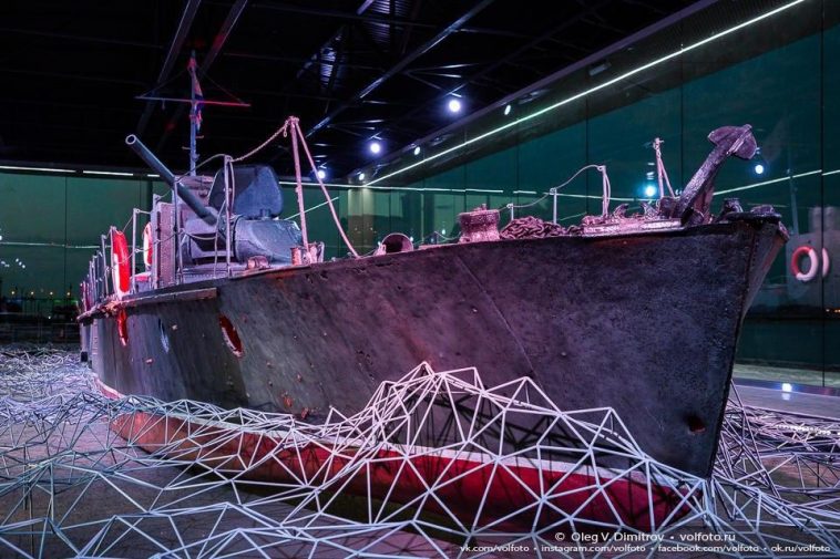 Тщательно и весьма грамотно отреставрированный корабль – специалисты оставили следы от снарядов на его бортах – плывёт по виртуальным волнам в стеклянном саркофаге с видом на Волгу, рассказывая посетителям о подвиге речников Волжской флотилии.