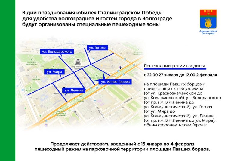 Первую часть улиц, временно перекрытых для движения транспорта в связи с мероприятиями в честь 80-летия Сталинградской Победы, разблокируют уже после 12:00 2 февраля. Речь идёт об улицах Гоголя, Мира, Ленина и Володарского, окружающих площадь Павших борцов, где состоялся парад.