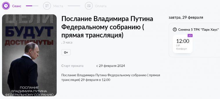 На сайте волгоградского кинотеатра есть анонс послания, его длительность обозначена в районе 3 часов. Пройдёт трансляция в зале комфорт-класса, рассчитанного на 190 зрителей, в том числе 12 – маломобильных.